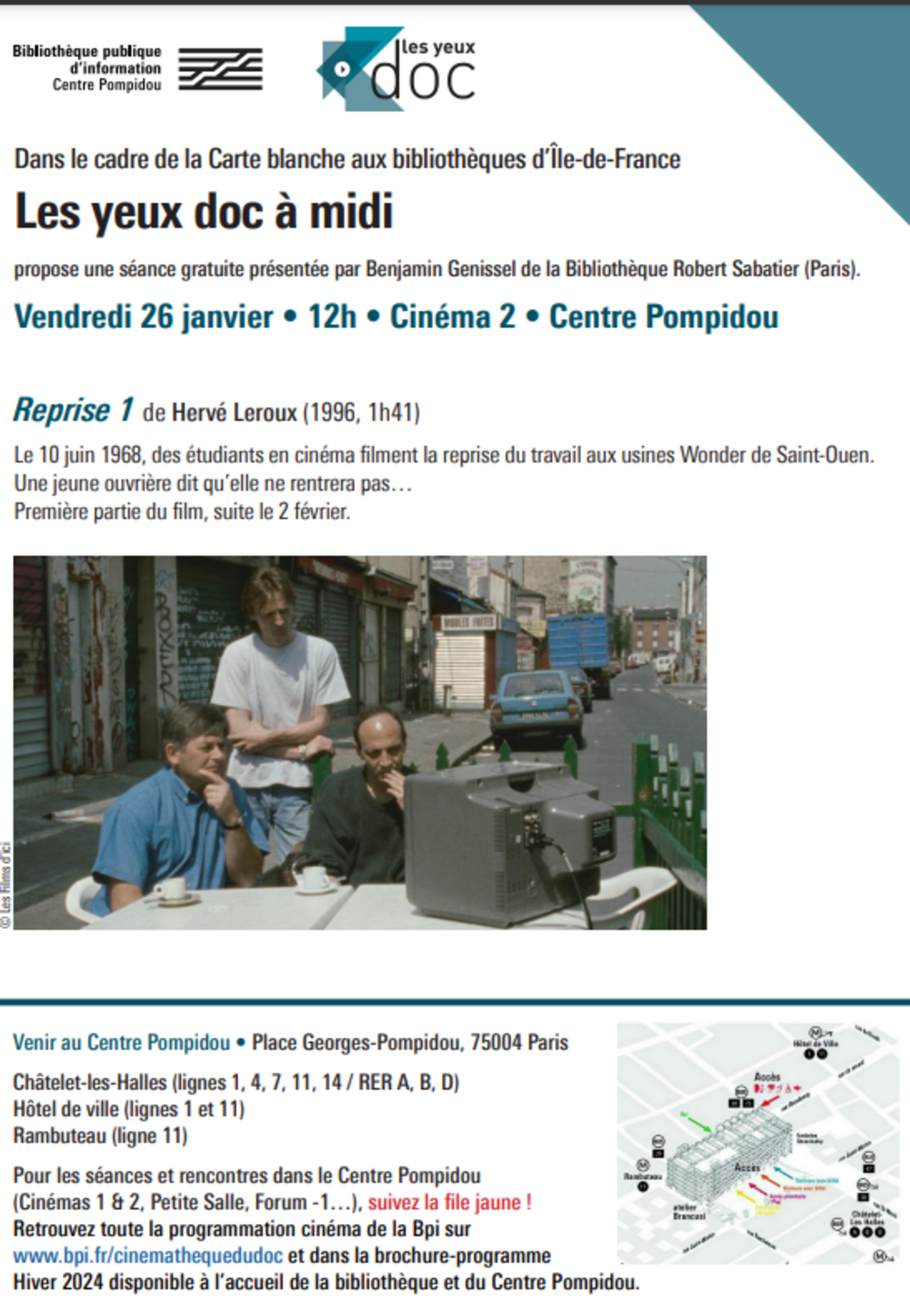 Attention : événement. Et même double événement. La Cinémathèque du documentaire au Centre Pompidou projette Reprise de Hervé Le Roux.