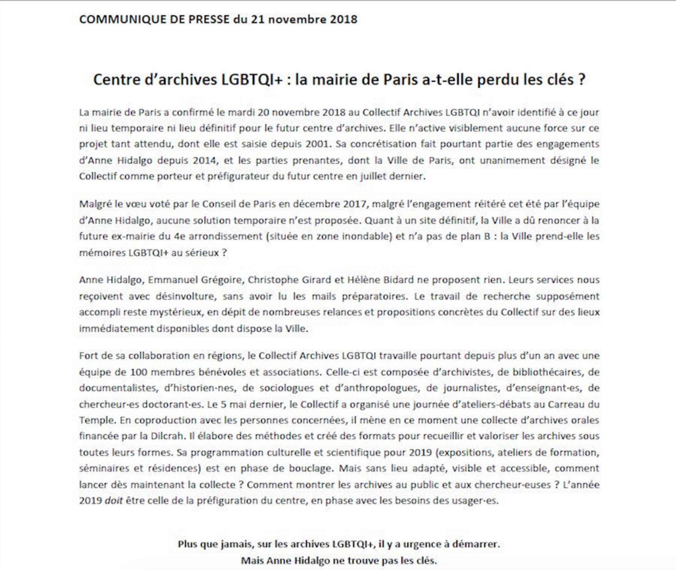 Un collectif « Archives LGBTQI » a été désigné pour mener le projet à bien. Ils souhaitent un lieu pour rassembler des « archives pérennes, ambitieuses, ouvertes, inclusives. » Mais alors que de nombreux particuliers collectent documents, preuves, objets du passé et des luttes LGBTQI, le projet semble stagner, la mairie ne trouvant pas de lieu, « ni temporaire ni définitif ». Pendant ce temps, d’après les termes d’une pétition lancée par le comité, « les mémoires se meurent ».