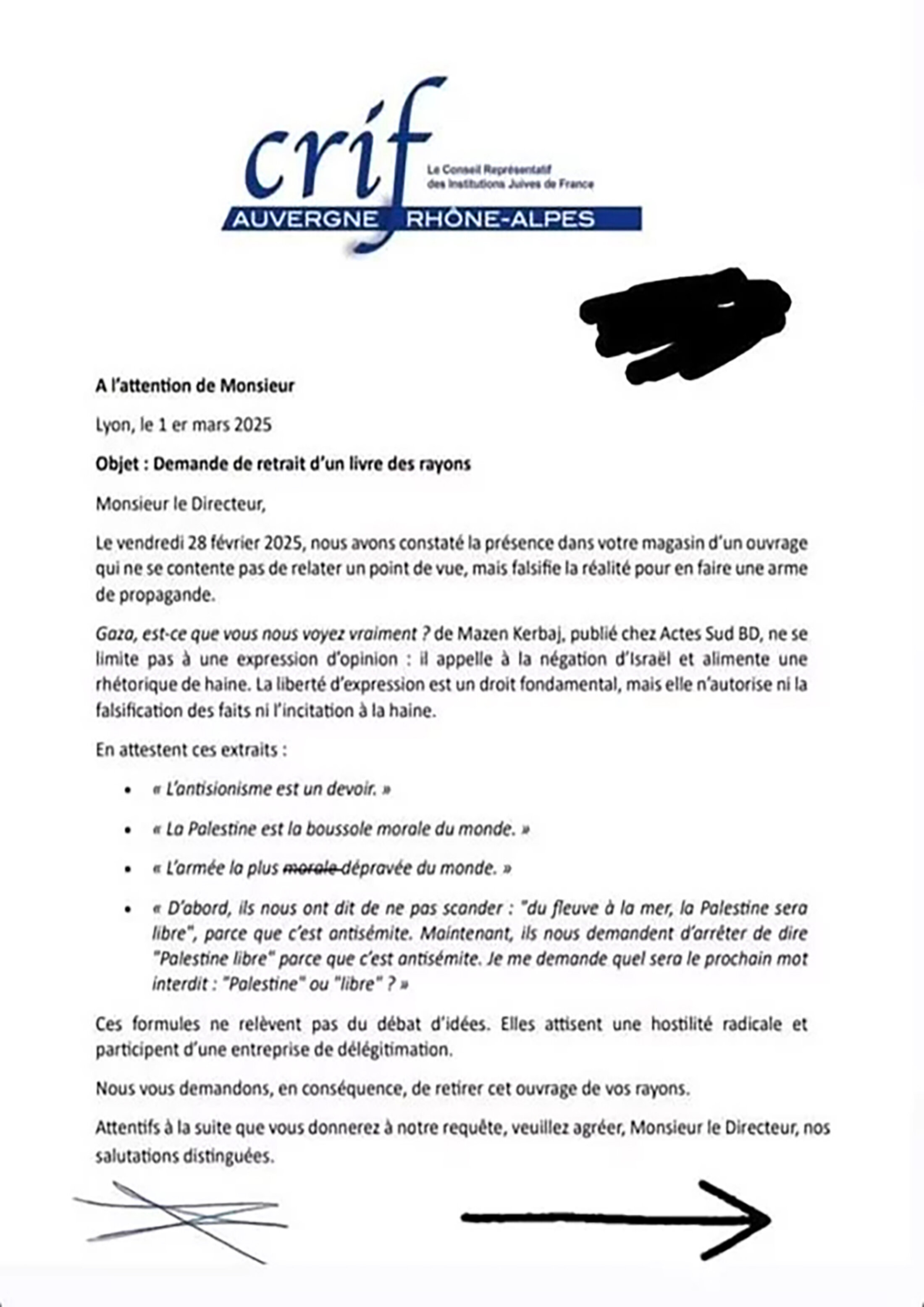 De quel droit le CRIF-AURA s’arroge-t-il le droit de dire ce que l’on peut lire et pas lire, vendre et pas vendre ? Il se prend pour qui : Goebbels, Vychinski, Torquemada ? Nous laissons les esprits libres prendre connaissance du « poulet » et de sa convocation de police des basses œuvres de cette engeance liberticide et aussi de quelques dessins de Mazen Kerbaj. Chacun pourra juger sur pièces.