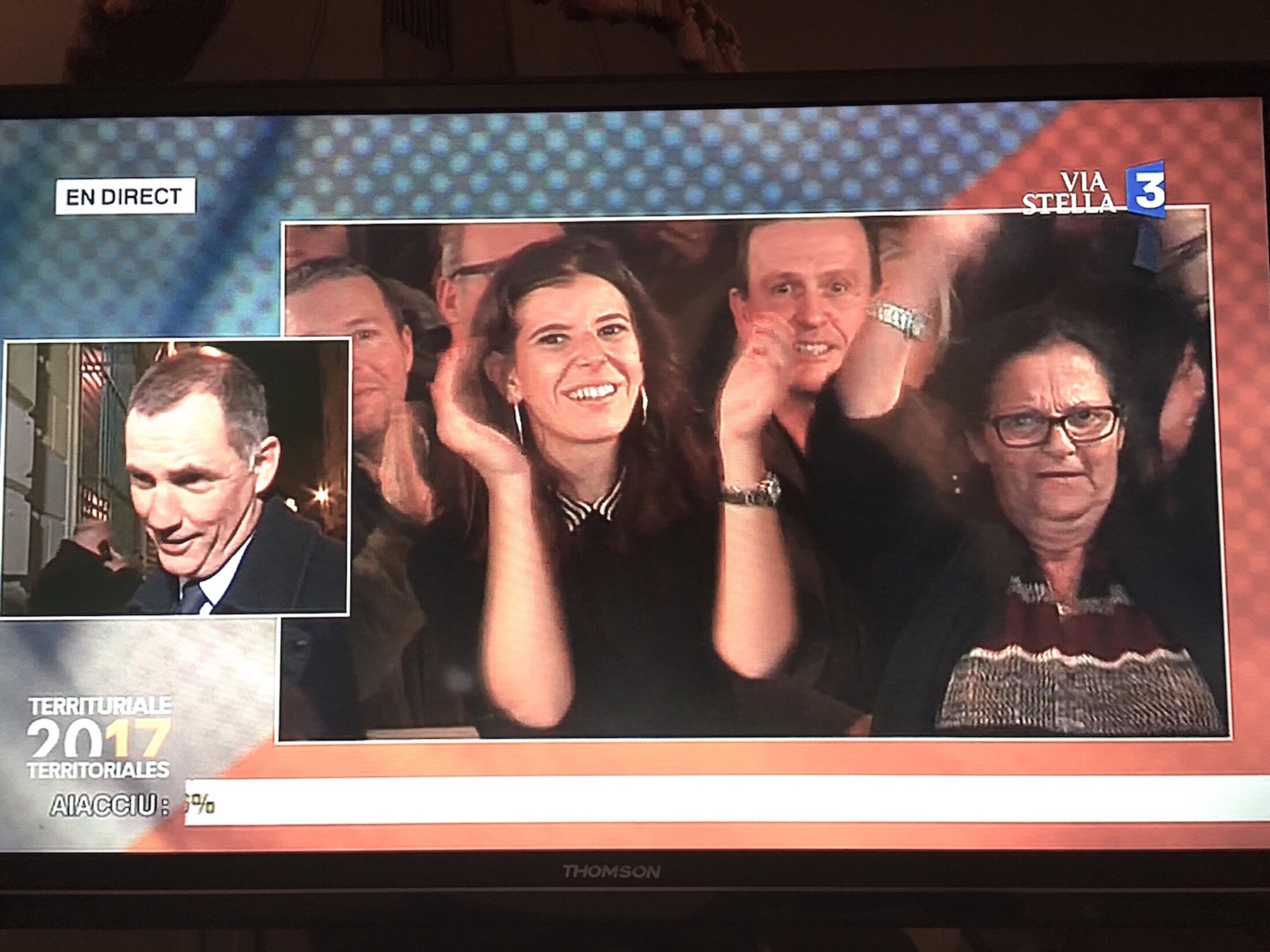 Gilles Siméoni, le formidable rassembleur charismatique est acclamé lors de son arrivée à la mairie de Bastia dont il fut maire en 2014 avant de prendre les commandes du Conseil Exécutif de Corse en décembre 2015. Depuis 2014 véritable point de bascule politique : la Corse connait une percée ascendante du vote autonomiste, nationaliste et indépendantiste, avec les victoires de la Mairie de Bastia, les Territoriales de 2015, les Législatives de mars 2017 et maintenant les Territoriales de 2017 qui précèdent l’installation de la Collectivité Territoriale Unique qui prend effet en janvier 2018.