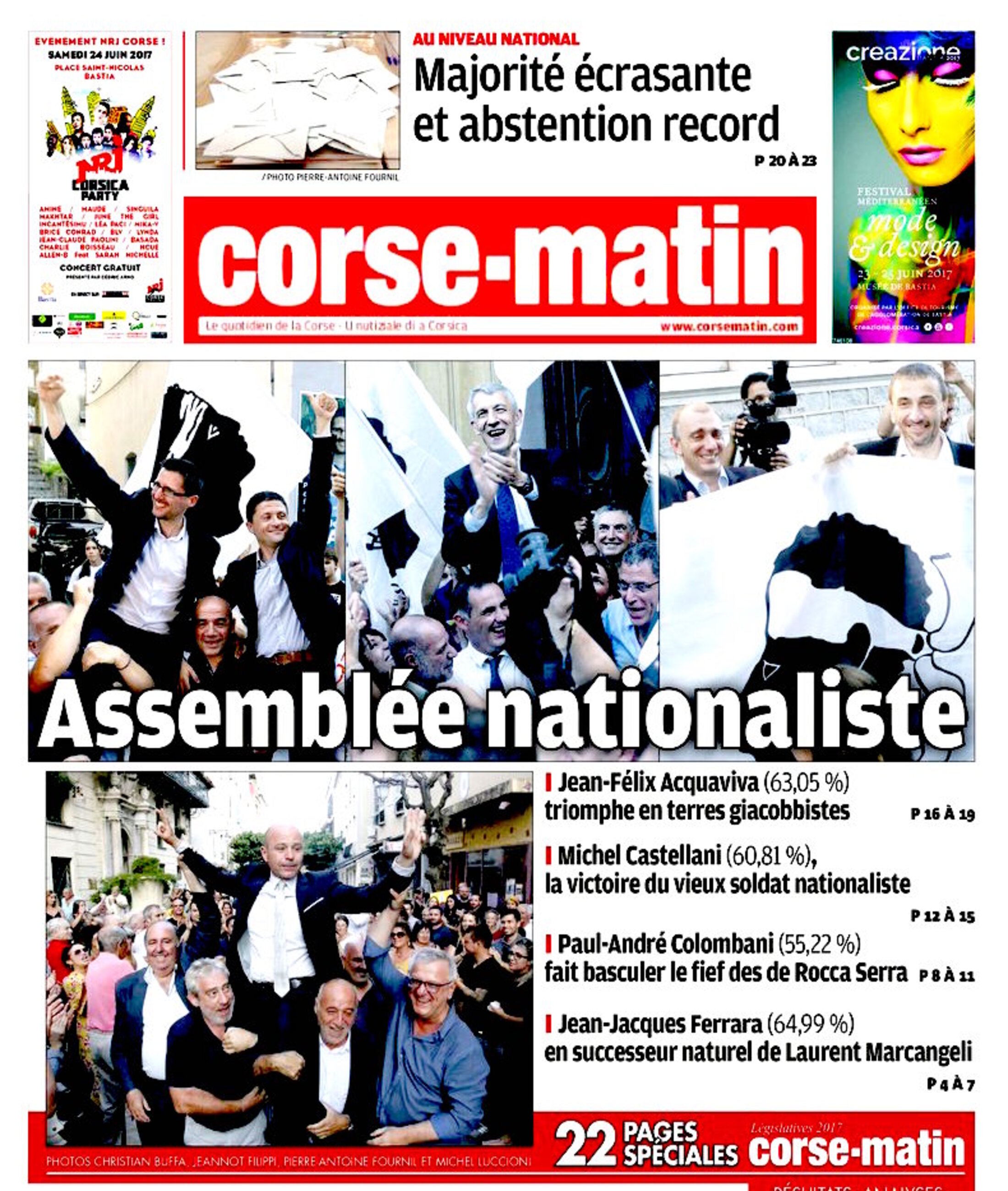 Les estimations sont tombées à 20h piles sur France 3 Corse ViaStella, et c’est une première historique ! Trois députés autonomistes corses " Pe a Corsica" , la presse nationale parle de "députés nationalistes" , siègeront à l’Assemblée Nationale. En Corse-du-Sud Paul-André Colombani ( médecin 49 ans suppléant Pierre-José Filiputti) ) avec 55, 9%, a battu avec une avance assez confortable le vétéran LR Camille de Rocca Serra, une dynastie père et fils qui régnait sur la circonscription de Porto-Vecchio depuis 1962.