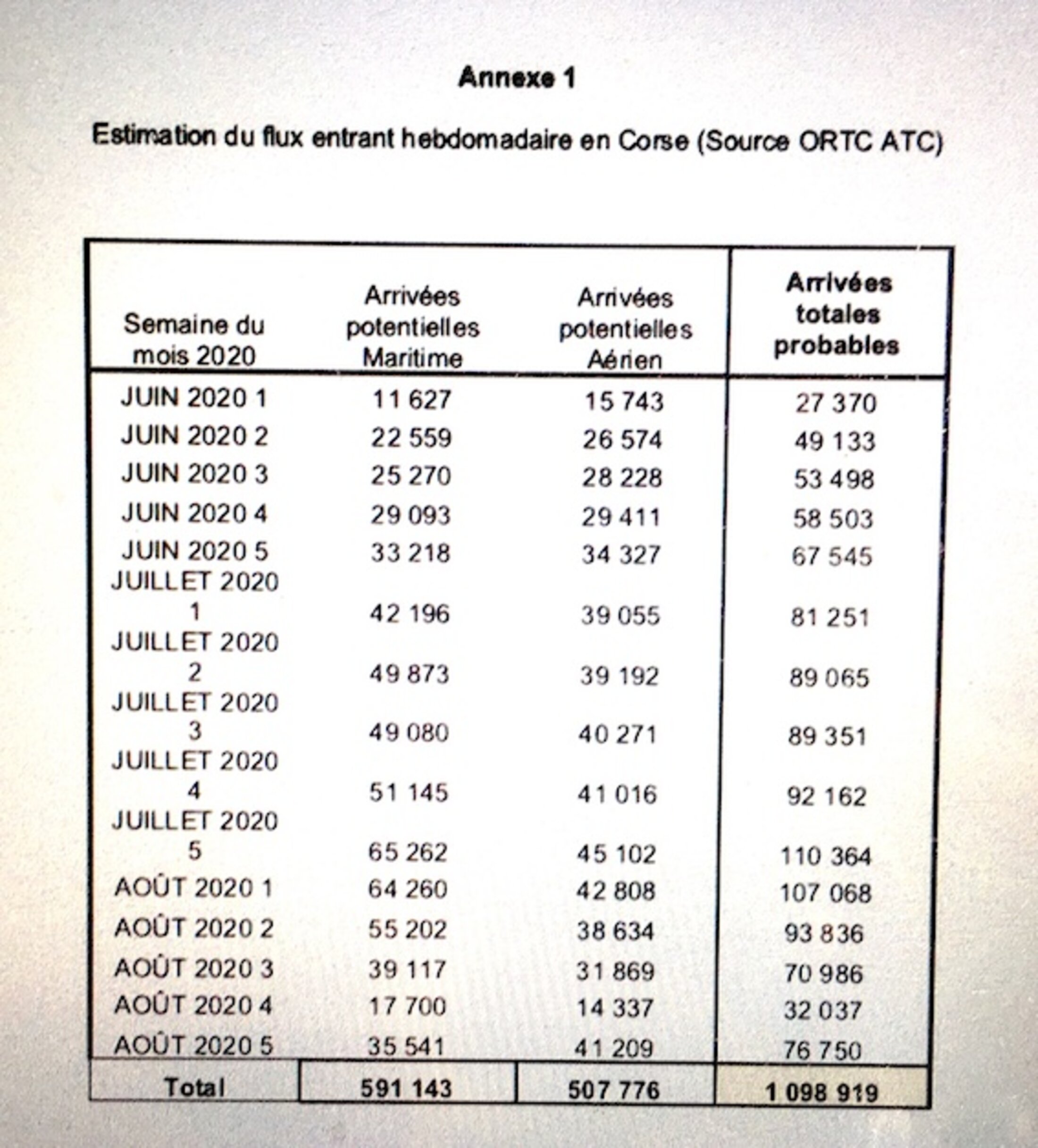 L'analyse scientifique reposant sur les arrivées cumulées en juin, avec 2 hypothèses : une sur les flux entrants sans aucun test des touristes, l’autre sur les mêmes flux entrants, avec test PCR du Covid-19 (4 à 7 jours avant voyage).