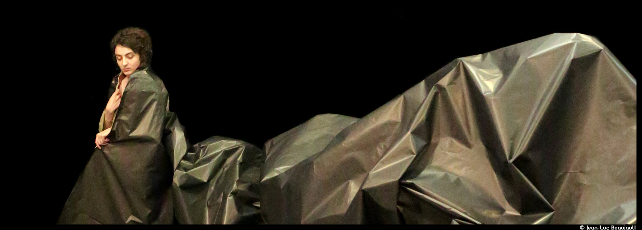 Au cœur de l’obscurité, un vent ronflant de tempête envahit l’espace de son souffle puissant, sonore. La voix de Phia Ménard s’élève contant le destin tragique de quelques oisillons bernés par le rayon pernicieux d’une aurore factice et trompeuse qui n’annonce point le lever du jour, mais bien la continuité d’une nuit sombre et ténébreuse. Dans la pénombre, le corps d’une jeune femme (lumineuse Chloée Sanchez) de blanc vêtue apparaît. Il semble bringuebalé par les flots furieux d’une mer houleuse de plastique noir. La lutte est bien vaine. Inéluctablement, il disparaît, englouti dans les eaux profondes.