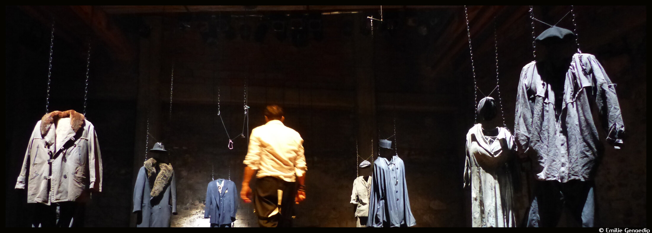 Etrange décor que celui qui s’offre aux yeux du spectateur quand il pénètre dans la salle du Studio Hébertot. Dans la pénombre de la scène, une dizaine d’étranges silhouettes apparaissent. Accrochés aux cintres du théâtre par des chaînes, ces corps désincarnés, ces vêtements d’un autre temps, d’un autre siècle, vidés de leurs propriétaires, offrent une vision glaçante, sépulcrale d’un monde depuis longtemps englouti dans les mémoires de nos ancêtres.