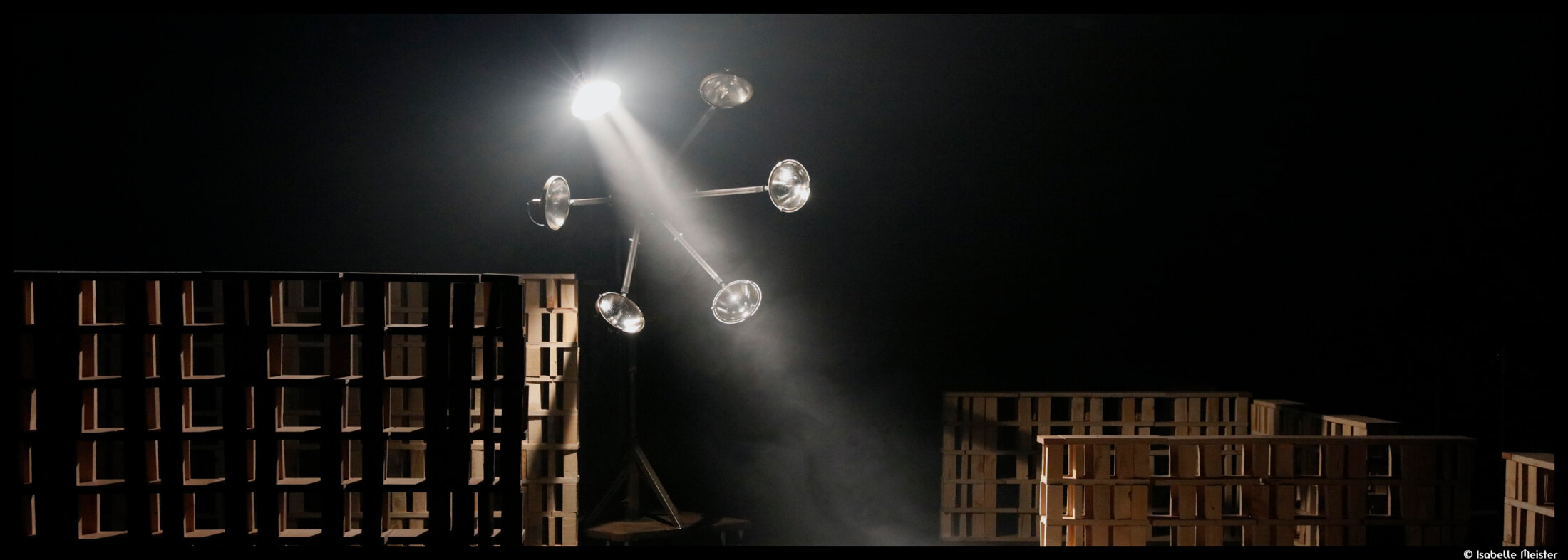 L’annonce, telle une déflagration puissante, a fait l’effet d’une bombe dans la tête de l’auteur. Les tours de son enfance vont être détruites en 2019. De cette nouvelle salvatrice autant que cafardeuse, Karim Bel Kacem en tire une sombre litanie, un conte mélancolique entremêlant passé, présent et futur. Reconstituant à l’aide de planches de bois, avec l’ingénieuse complicité de son scénographe Jonathan O’Hear, les immeubles qu’il connaît dans les moindres détails, il leur imagine une vie entre réalité et fiction. D’un soir d’émeutes, où les murs semblent s’embraser, à une soirée banale où un fils réclame un peu d’argent à sa mère, en passant par le discours d’un André Malraux en verve qui promettait monts et merveilles à ceux qui viendrait peupler ces nombreux appartements construits sur le même modèle fonctionnel, imperceptiblement, il guide sa cité vers sa fin programmée, son explosion en mille éclats de vie.