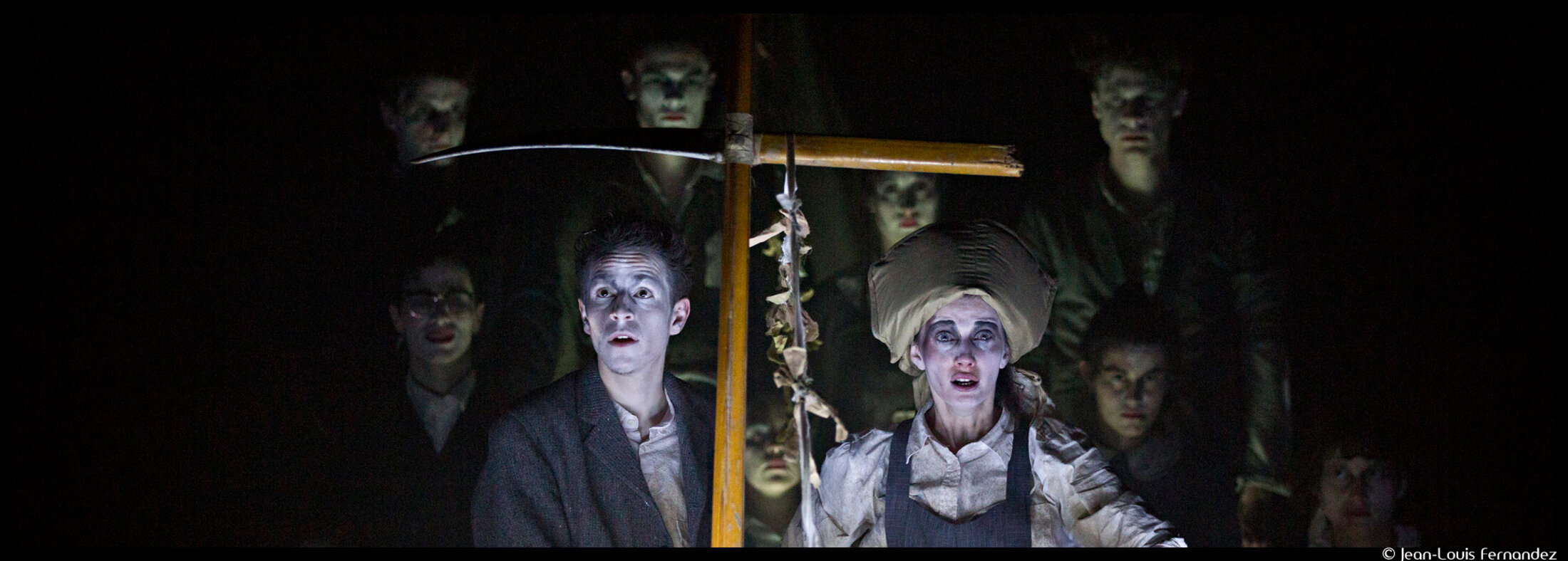 En homme de théâtre, préférant les tréteaux à l’artifice, s’attachant aux jeux bruts des comédiens plus qu’aux artifices qui alourdiraient un propos déjà particulièrement dense, Thomas Jolly s’empare de ce conte philosophique pour en souligner toute la noire malice, toute la sombre sagacité. Jouant sur les clairs-obscurs, les intensités différentes de lumières, il nous plonge dans un univers onirique baroque et romantique dont il a le secret et qui n’est pas sans rappeler le tableau de Géricault, qui a donné son nom à la pièce. Si on peut regretter que l’atmosphère soit plombée par un texte emprunt de religiosité exacerbée et par une mise en scène ingénieuse et sobre qui en accentue l’effet, il ne faut pas oublier que ce stratagème est nécessaire pour montrer à quel point nos âmes sont très tôt manipulées par des principes religieux à géométrie variable. En dénaturer l’essence est un mal nécessaire permettant de sauvegarder les apparences et nos bonnes consciences quels que soient les actes répréhensibles et odieux que l’on commette.