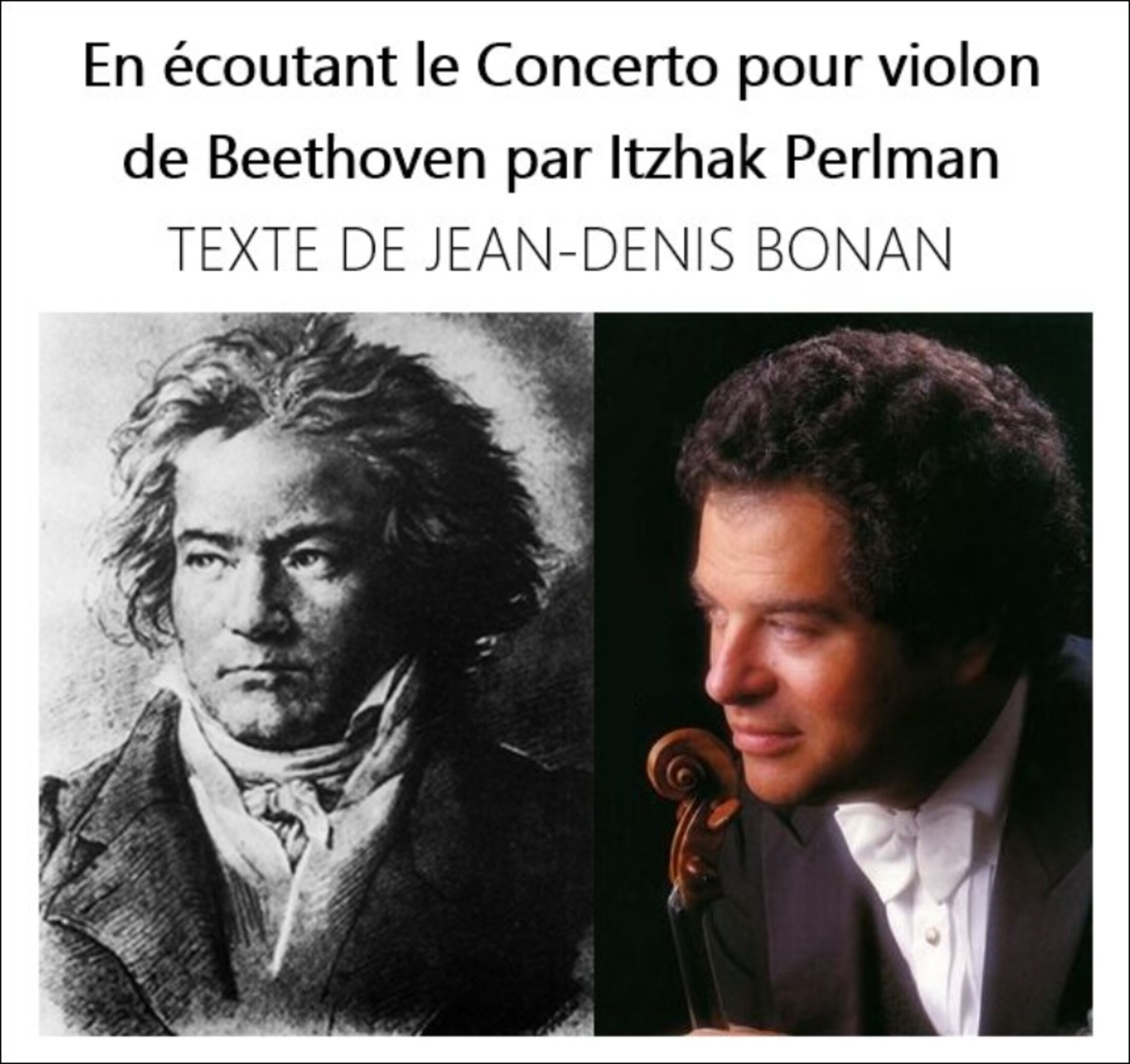 Le poète considérable qu'est Jean-Denis Bonan nous propose donc ici un somptueux texte inédit, en hommage à l'interprétation du Concerto pour violon de Beethoven par Itzhak Perlman avec l'orchestre philharmonique de Berlin dirigé par Daniel Barenboim. Un immense merci à Jean-Denis Bonan pour ce texte magnifique, qui contient des mots essentiels à propos de ce concerto inégalable. Un cadeau pour tous les Beethovéniens en particulier.