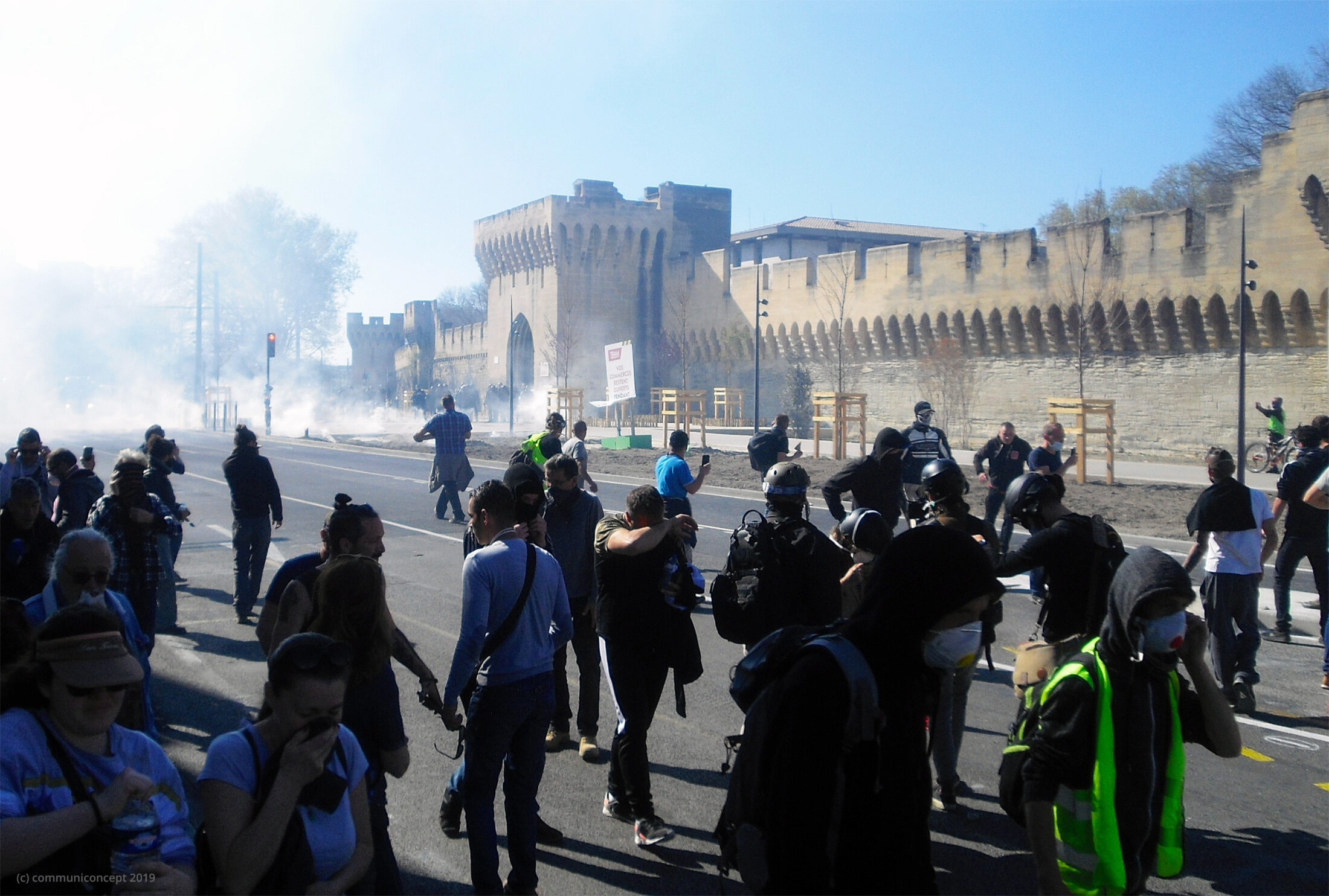 Le bon moment pour enfiler mon gilet jaune me dis-je, alors que je commençais à me résigner. Il y a bien 2000 personnes, des gens qui ont réussi à venir d'un peu partout, de la Drôme, de la région lyonnaise, du Gard, du Var ou d'ailleurs; une équipe de médics stationne un peu en retrait le long d'une façade prête à intervenir en cas de besoin. Nous sommes à côté de la Préfecture qui est encerclée de toute part par les CRS (fourgons blancs). Le gros de la manif remonte le cours Limbert rencontrant au passage un beau défilé de nombreux motards GJ (merci à vous encore une fois). Au loin les forces de l'ordre sont là, ca commence à gazer, ils nous enferment. Un gros rassemblement s'opère au niveau de la rue Pierre Sémart en face de la porte. Le cortège disparait alors et s'éloigne du centre ville par cette même avenue, celui-ci reviendra plus tard par l'avenue Saint Ruf me semble t'il. De nombreux policiers (dont la bac reconnaissable à leur brassards oranges et leur matraque ou menottes dans le Jean !!!) font les plantons devant la banque populaire, on craint la casse évidemment, il faut dire qu'il fait chaud en Avignon et pas seulement à cause du soleil qui tape ! Je remonte alors vers la porte St Michel, vers les fumées des lacrymo que l'on perçoit au loin, en suivant un petit groupe de musiciens.
