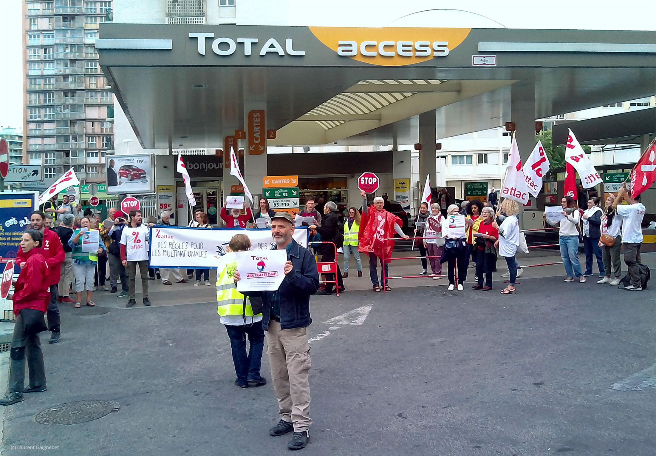 Il est 11 H 30 ce samedi 12 octobre à Marseille quand quatre vingt militants d'ATTAC se regroupent pour participer au blocage d'une station service "TOTAL Access" située à l'angle du Bd Sakakini et du Bd Chave. L'action est organisée et a été minutieusement préparée. Elle doit durer 30 minutes au maximum et se dérouler sans aucune dégradation et de façon pacifique. Certains sont chargés d'aller au contact des usagers et des responsables de la station dans un but d'explication de l'action, d'autres de porter des banderoles, des drapeaux à l'effigie de l'association, des panneaux "STOP" en carton ou des slogans imprimés.