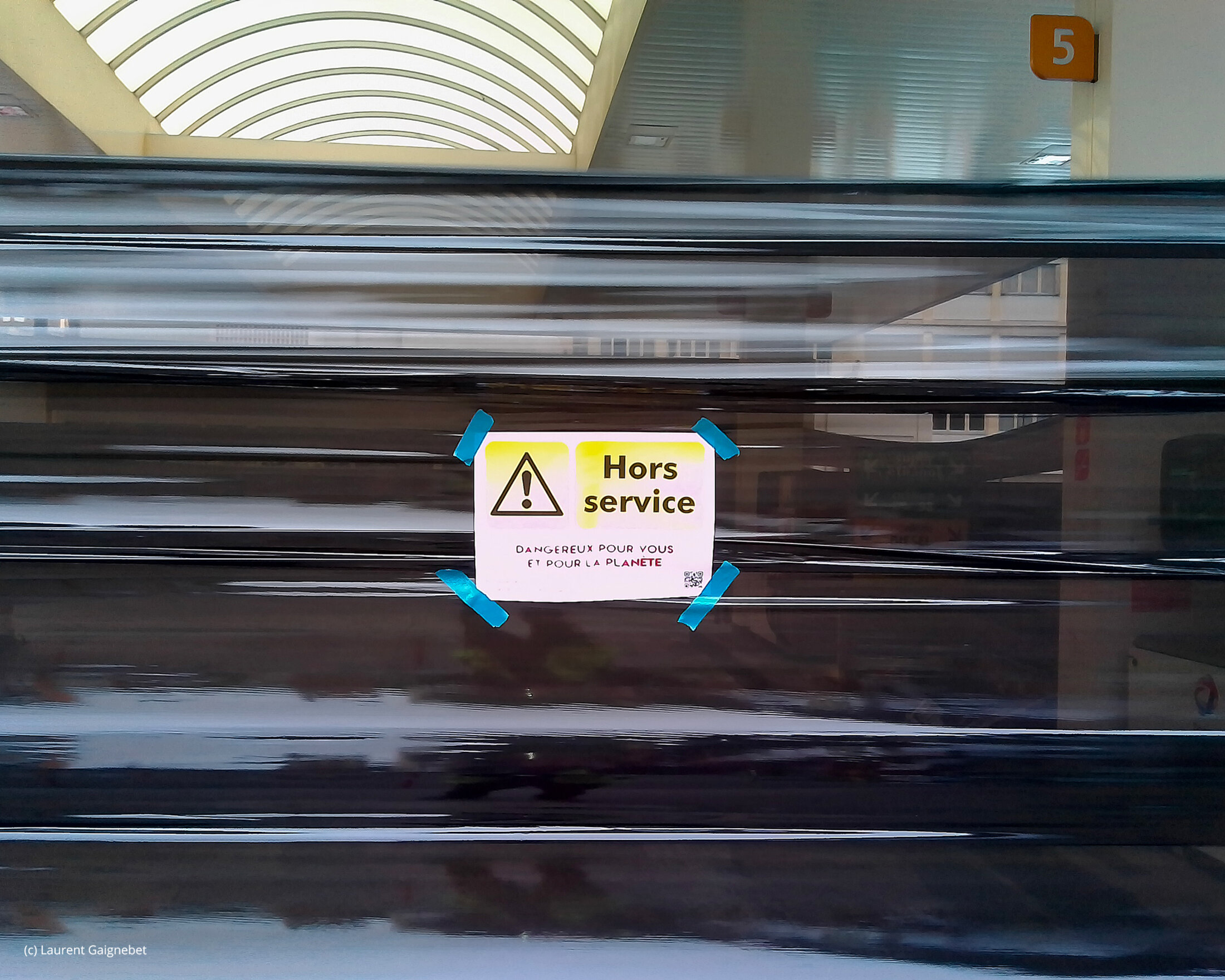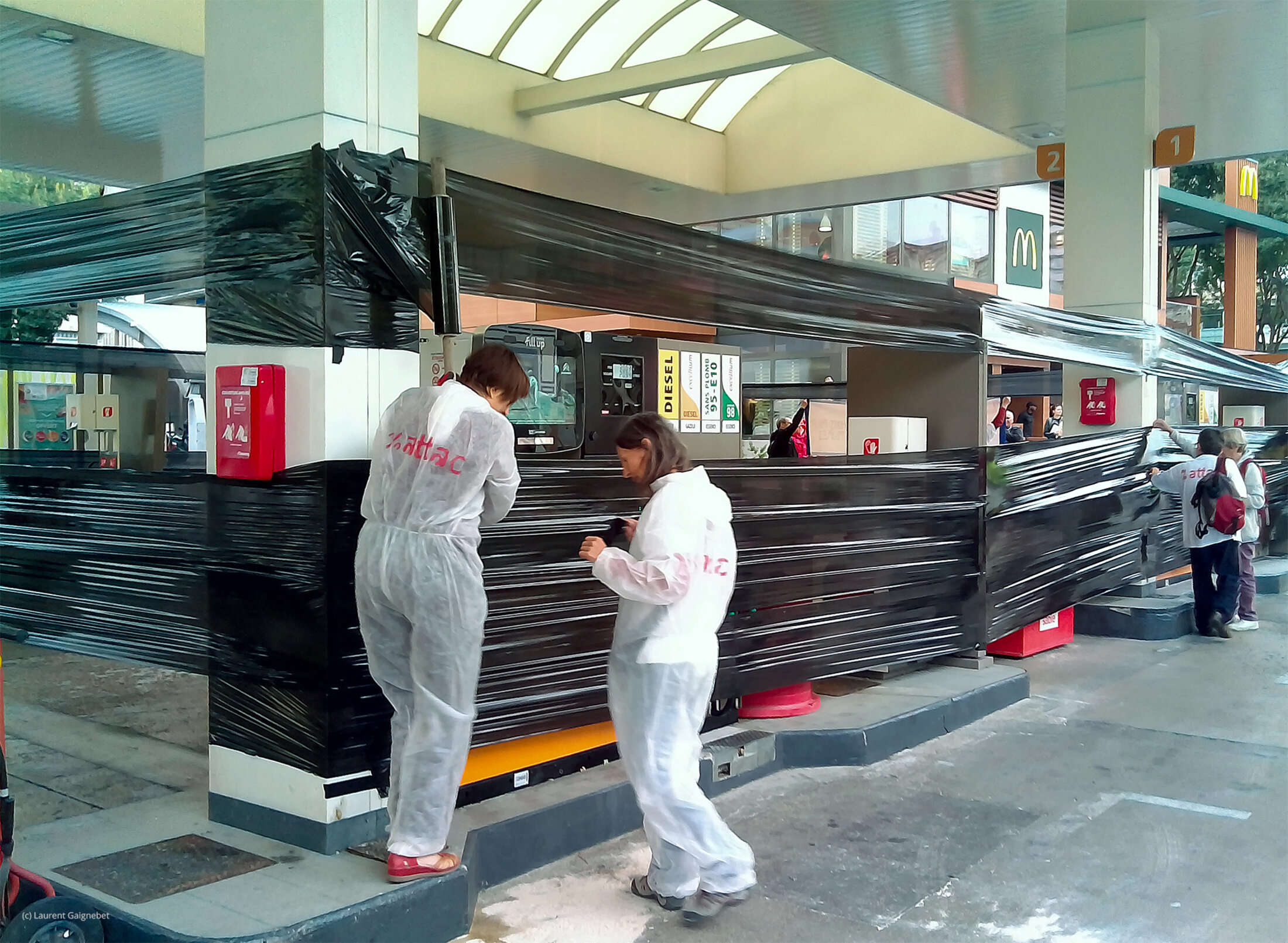 de la sono, de la distribution de tracts aux piétons et automobilistes, de prendre des photos ou de filmer pendant que la station est joliment emballée dans un film de plastique noir qui fait le tour des quatre piliers sur une hauteur de 1m80.