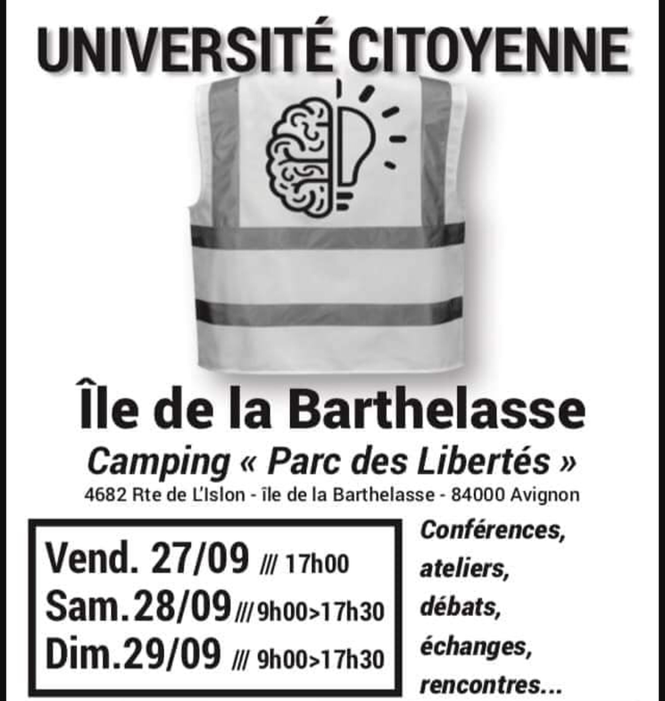 Les Gilets Jaunes de la région PACA organisent une Université Citoyenne les 27, 28 et 29 septembre en AVIGNON au Parc des Libertés de l’île de la Barthelasse