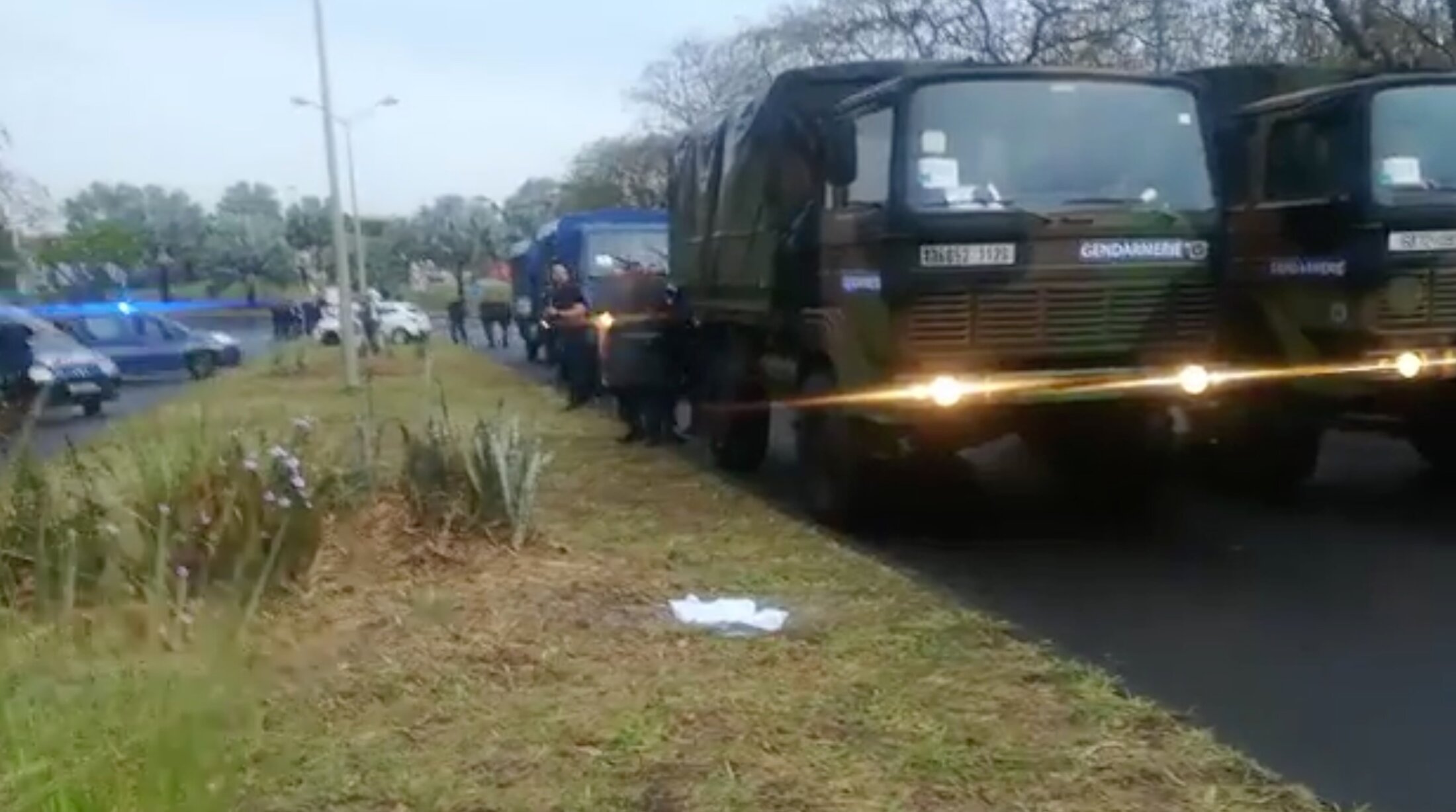 "C'est ça la démocratie de Macron : empêcher les gens de manifester. Les deux cent personnes qui étaient là sont partis depuis longtemps." On aperçoit les motards au fond, le convoi arrive. "Ils sont venus fanfaronner pendant trois jours." Au passage on apprends qu'une femme en fauteuil roulant a eté gazée, mais ça, on commence à avoir l'habitude en métropole !
