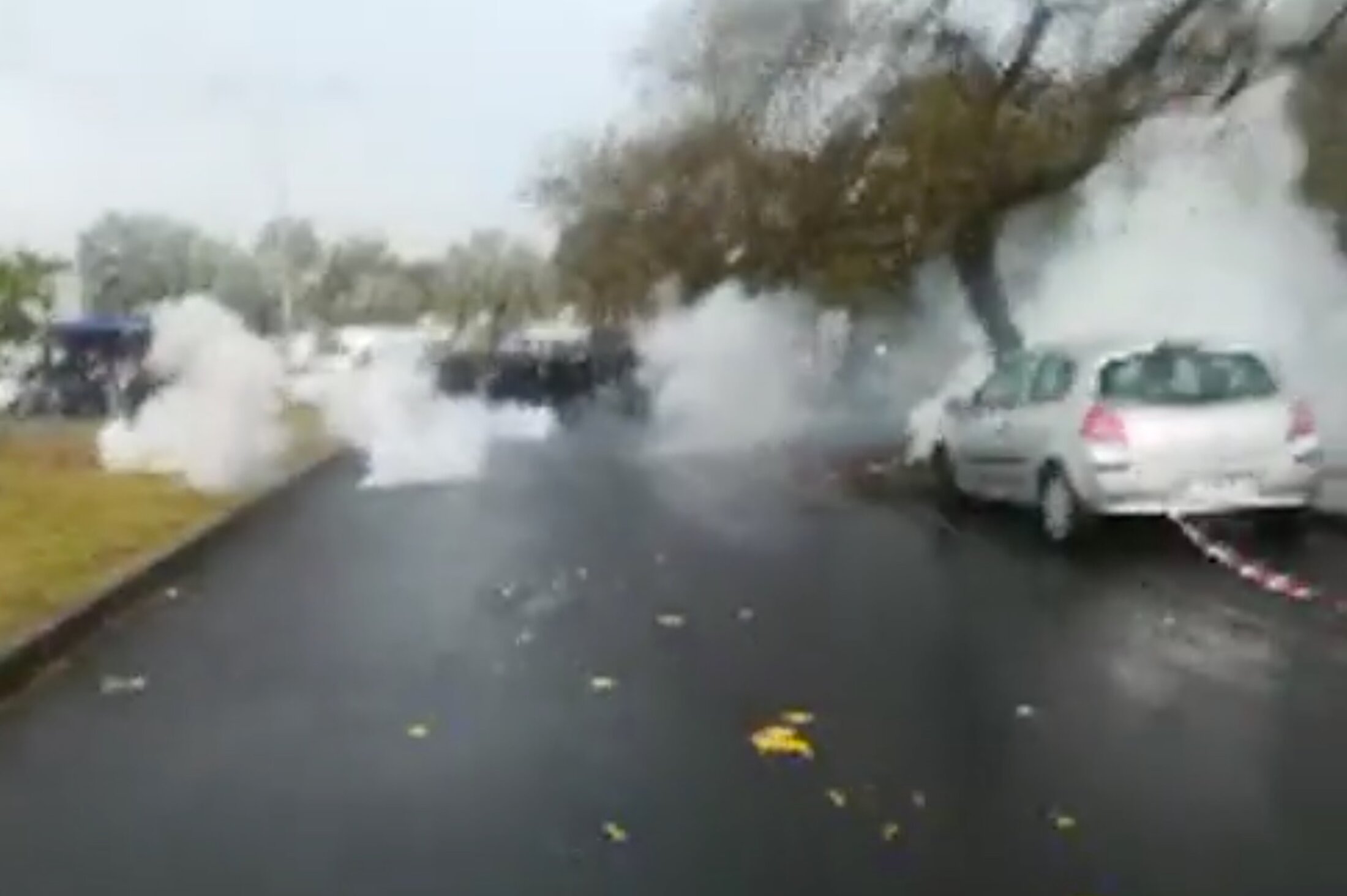 Maintenant que "Monseigneur" est passé, les gendarmes se replient. Mais attention, pas n'importe comment, en formation serrée, au pas de course, tirant au FlashBall pour assurer les arrières et balançant à tout va leur lacrymos, un véritable brouillard, jusque dans la forêt environnante (heureusement qu'il pleut !) Notre vidéaste en reçoit une prés de lui et sursaute, une autre arrive sous une voiture. "Ah ben si elle crame, on dira que c'est la faute des gilets jaunes bien sûr"