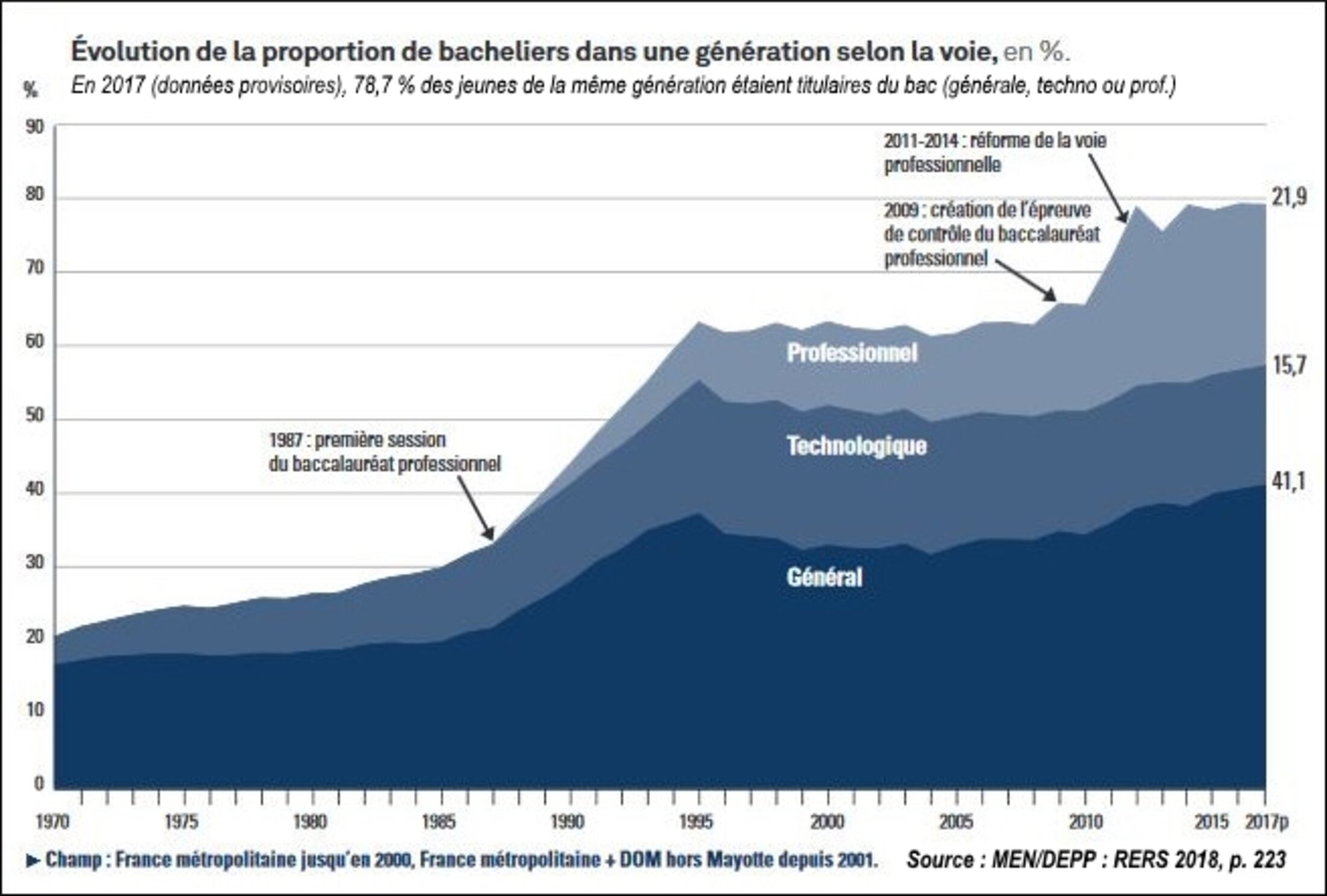 Lorsque j'ai moi-même passé mon bac (série B, aujourd'hui ES, modèle 1973), le bac pro n'existait pas et la très grande majorité de mes camarades en «bac de technicien», comme on disait encore, visaient l'entrée sur le marché du travail. Avec un bac général, on pouvait trouver du travail: c'est ainsi qu'après quelques pérégrinations que j'ai intégré à Paris l'école normale d'Auteuil chère à mon cœur (mon abbaye de Thélème) mais j'aurais pu, comme l'écrasante majorité de mes jeunes collègues, devenir directement instituteur suppléant. Avec un bac général, on pouvait passer les concours de catégorie B: contrôleur des PTT, des impôts ou du Trésor. On n'avait pas encore les effets de surdiplômation rencontrés aujourd'hui... ni le fait que certains concours de catégorie B sont ouverts à bac+2. On pouvait encore devenir employé de banque ou d'assurance.