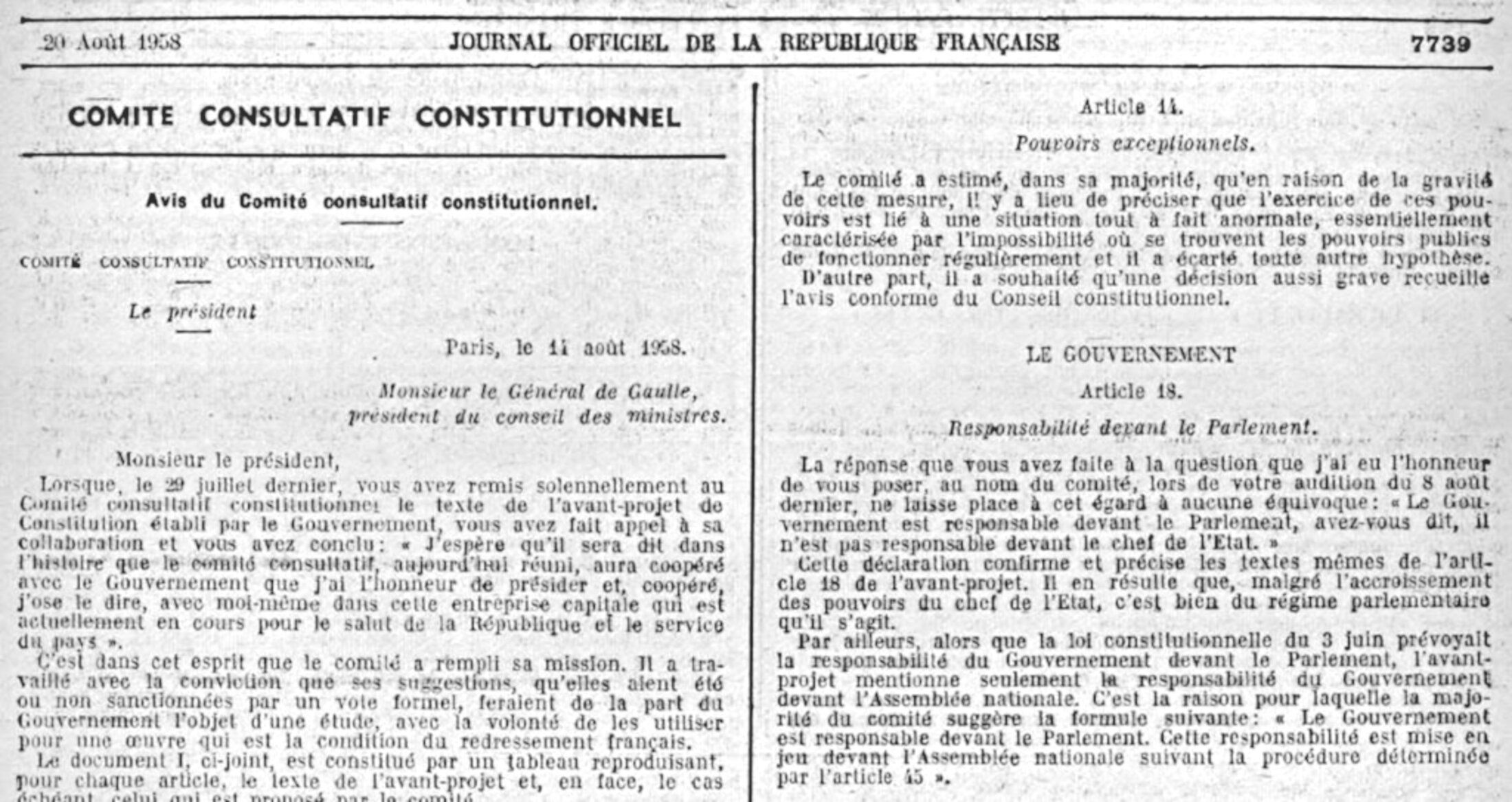 Cette question semblait si importante à Paul Reynaud qu'il la fit figurer dans l'avis du Comité constitutionnel consultatif sur l'avant-projet de Constitution transmis le 14 août 1958 et officiellement publié au Journal officiel du 20 août (JORF, édition lois & décrets, nº 194, p. 7739 et suiv.: voir l'avis intégral ici). Les numéros d'aticles définitifs ont pu changer dans la version définitive en raison d'adjonctions ultérieures (ainsi la mention de l'article 14 sur les pouvoirs spéciaux correspond à l'article 15 et celle de l'article 45 à l'article 49 qui traite de l'engagement de responsabilité et de la censure du Gouvernement par l'Assemblée nationale). Enfonçant le clou — mais dans un document qui constituait une trace officielle —, Paul Reynaud écrivait: