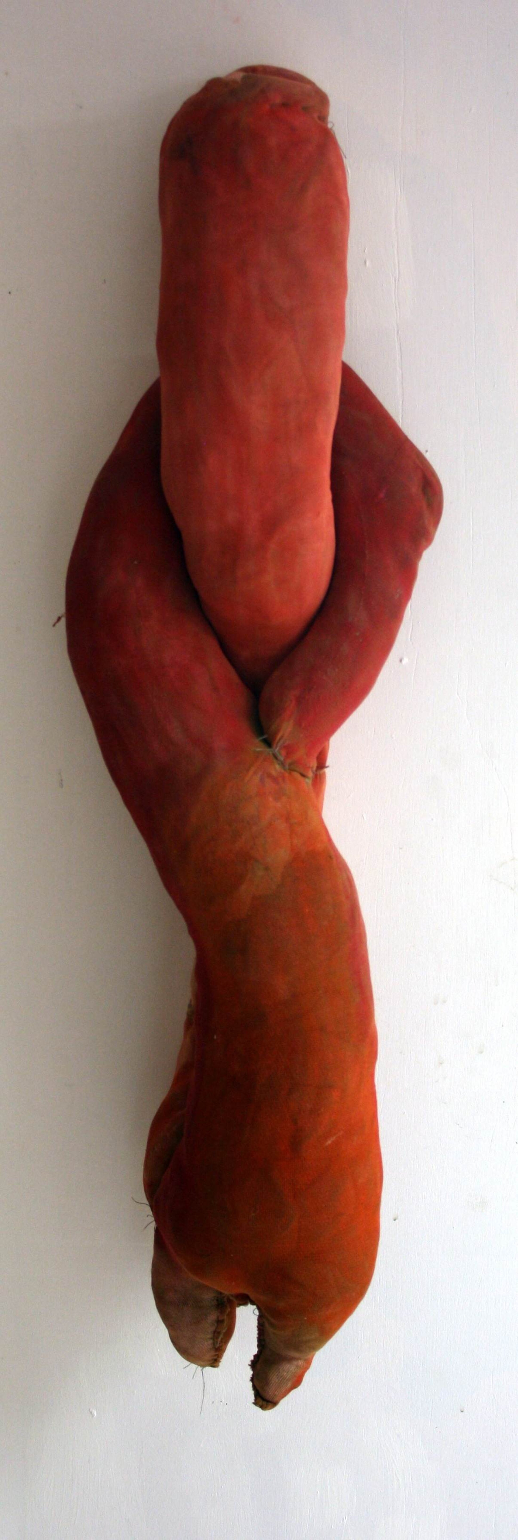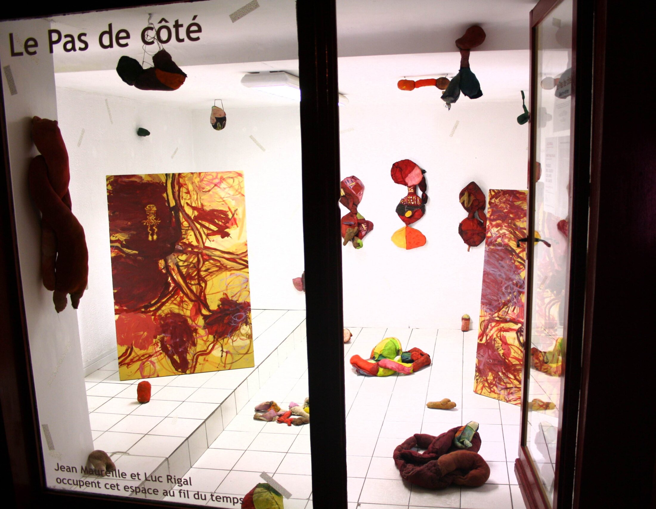 Je fais une pause, le temps d’un été, avec mon cycle d’expositions sur les catastrophes. Pour l’occasion, j’ai invité le peintre et sculpteur Mathias Milhaud à partager avec moi cette installation. Les volumes qu’il présente, extraits d’une importante série sous de multiples formats, sont obtenus à partir de pièces de vêtements et de bas féminins rembourrés, cousus et peints. Ils conjuguent leurs rythmes avec ceux des paysages organiques que je propose en peinture (série des « Parcours »). En perspective : investir en duo des moments d’arrêt du regard et de reprise, de circulation vagabonde entre les objets présents, les plans, les représentations manifestes ou suggérées. En marge, finalement, de l’accélération que subit le quotidien d’aujourd’hui, en prise à la pressurisation rentable sur toute activité.