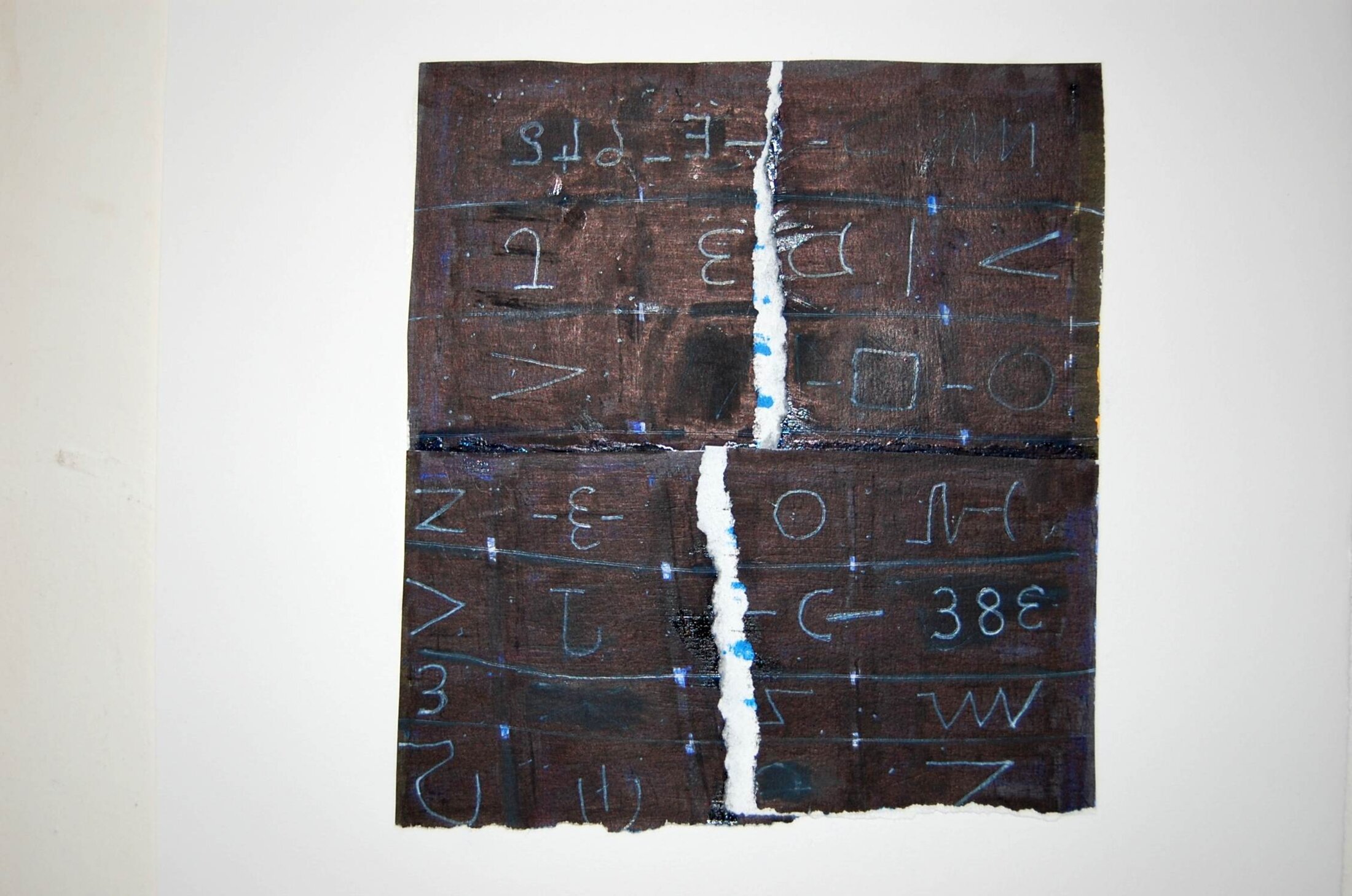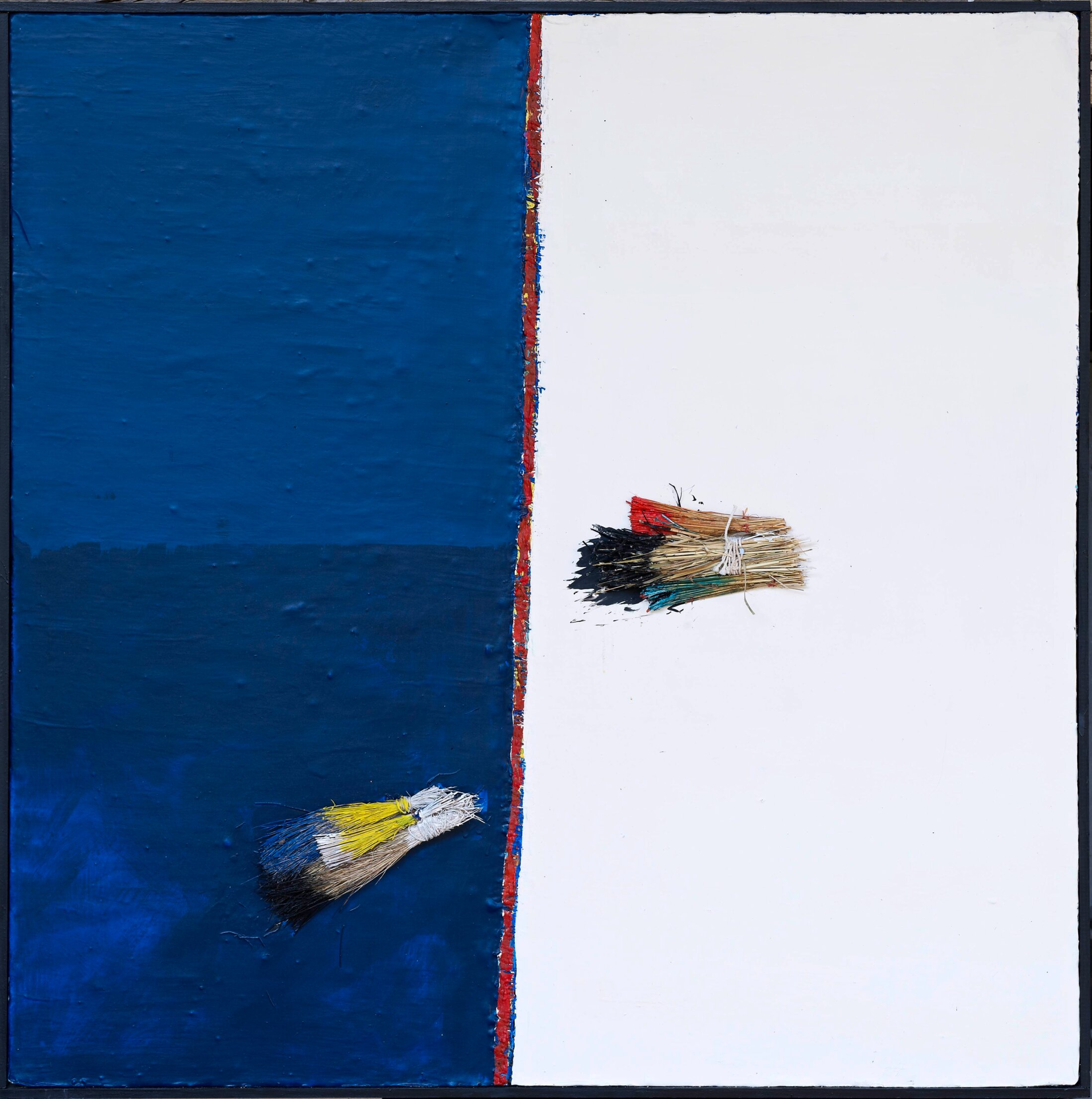 À cette dérivation pulsée, ce débridage de couleurs soigneusement ajustées, qui fait de cet artiste l’un des plus surprenants coloristes actuels, s’adjoint l’intromission de part en part de son agencement d’objets ou signes représentatifs des inflexions symboliques de l’humain. Un exemple est ce pinceau improvisé corrélatif au primitivisme du tableau. Constitué d’une poignée de brindilles ou d’herbes sèches nouées ensemble, il laisse une trace archaïque sur la surface de la toile qu’il rejoint à son tour, fiché par un corset de terre ou par scarification, passant ainsi d’outil générateur à résidu fétiche. D’une façon générale, l’objet exogène vient soutenir chez Nouyrit le caractère sacré de l’expression artistique, si ce n’est le mettre à l’épreuve, à l’inverse du rôle profanateur qu’un Rauschenberg lui attribue et à l’instar de l’impulsion qu’en retire un Miró, dont la capacité de transmutation esthétique se nourrit de tout. De même l’interprétation de l’abstraction, chez Nouyrit, n’est pas totalisante, comme souvent les créateurs de sa génération la perçoivent et ceux des générations antérieures. La saturation de la couleur ne sert pas de pont d’or, par exemple, au dépassement vers le sublime, tandis que l’incitation à l’expérience s’y avère irremplaçable.