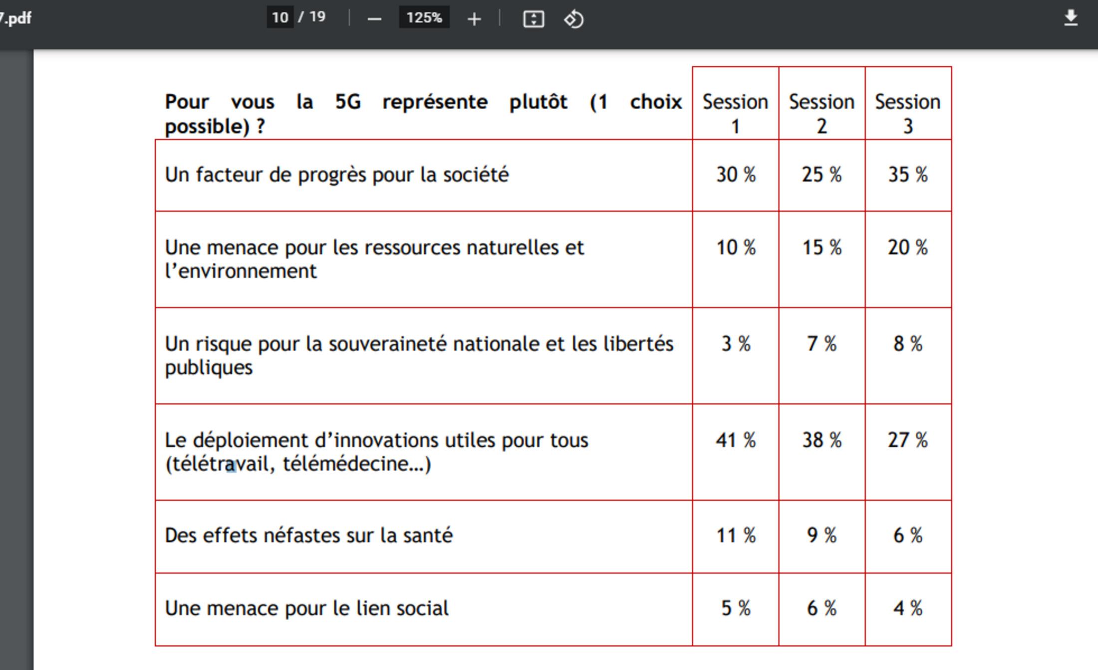 Revenons sur le rapport final de la concertation citoyenne sur la 5G, en page 10, un tableau sur la tendances des avis au fil des 3 séances de la concertation nous est communiquée :
