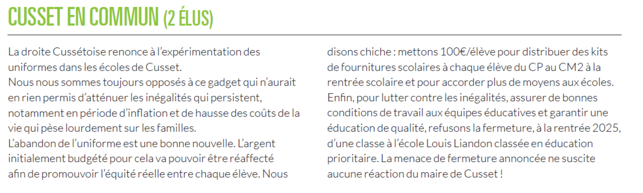 A Cusset, alors que la menace d’une fermeture de classe pesait sur la collectivité (sans que ça ne bouleverse beaucoup le maire et depuis confirmé par la nouvelle carte scolaire), l’opposition tirait la sonnette d’alarme et notamment au travers du bulletin municipal où elle fait le constat dur mais réaliste de la précarisation des foyers cussétois et des freins à l’accès décent à l’éducation. Elle suggère, en outre, la distribution de matériel aux élèves.