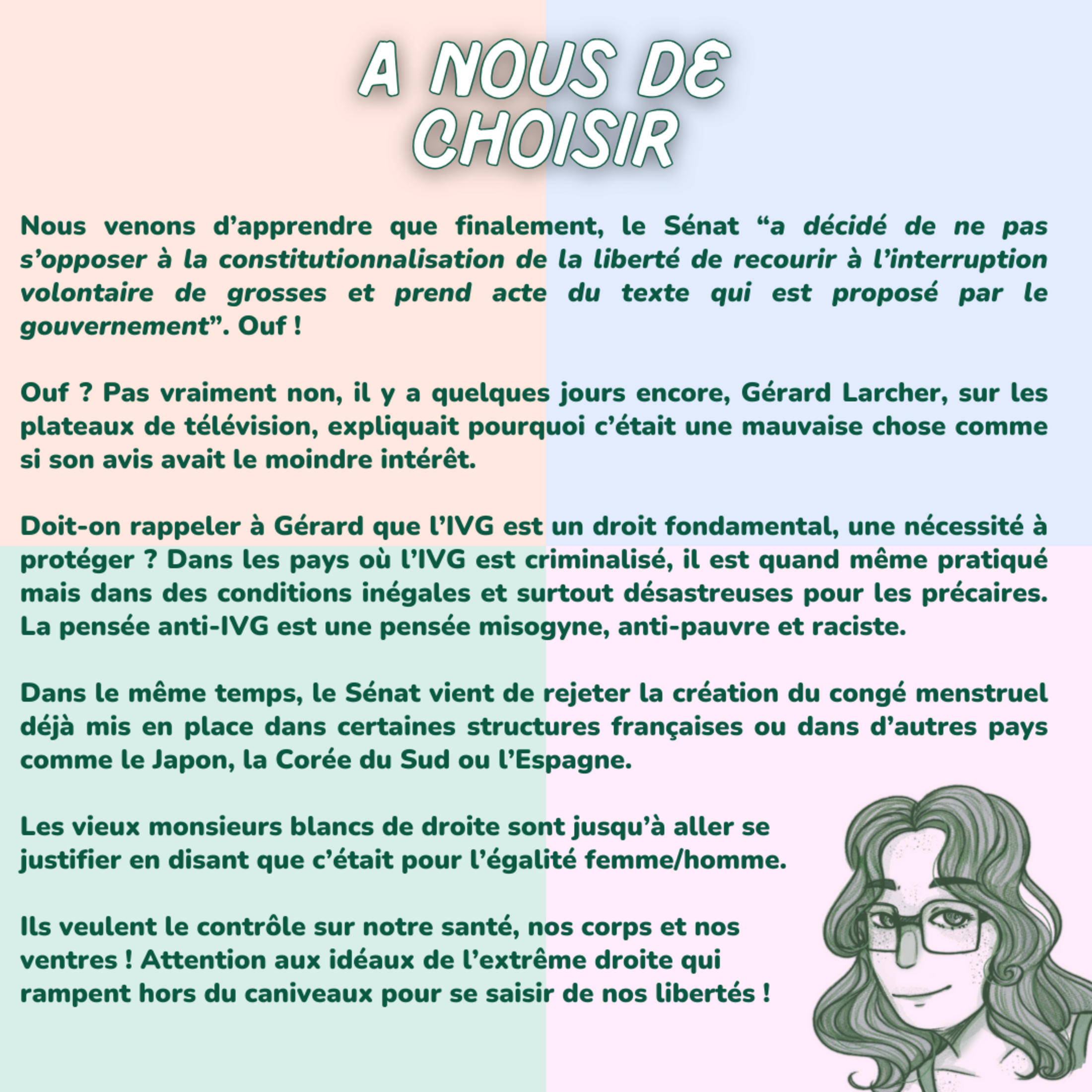 Doit-on rappeler à Gérard que l’IVG est un droit fondamental, une nécessité à protéger ? Dans les pays où l’IVG est criminalisé, il est quand même pratiqué mais dans des conditions inégales et surtout désastreuses pour les précaires. La pensée anti-IVG est une pensée misogyne, anti-pauvre et raciste.