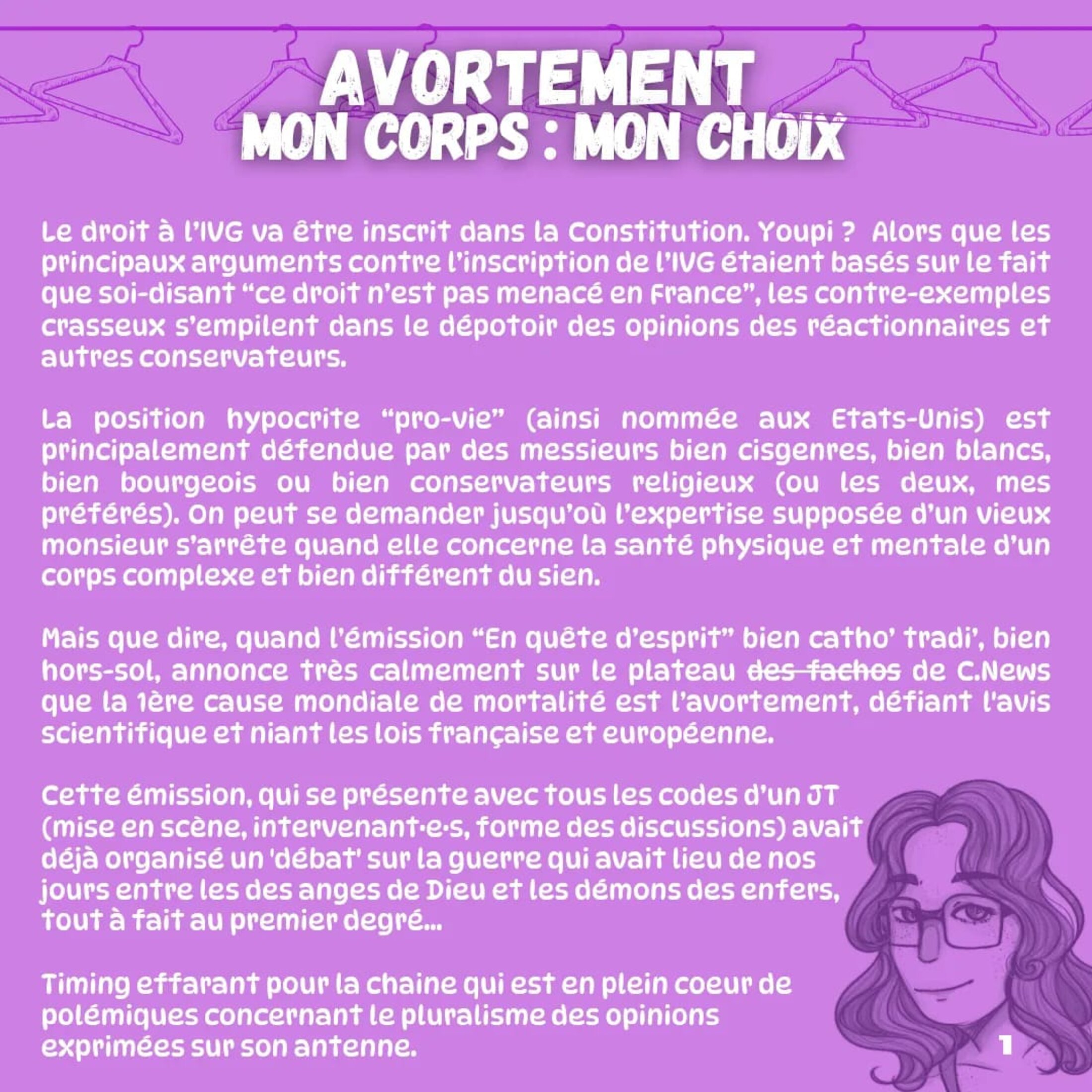 Mais que dire, quand l’émission “En quête d’esprit” bien catho’ tradi’, bien hors-sol, annonce très calmement sur le plateau des fachos de C.News que la 1ère cause mondiale de mortalité est l’avortement, défiant l'avis scientifique et niant les lois française et européenne. Cette émission, qui se présente avec tous les codes d’un JT (mise en scène, intervenant·e·s, forme des discussions) avait déjà organisé un 'débat' sur la guerre qui avait lieu de nos jours entre les des anges de Dieu et les démons des enfers, tout à fait au premier degré...