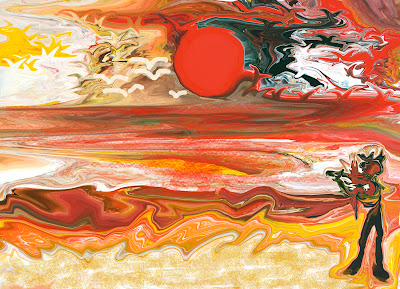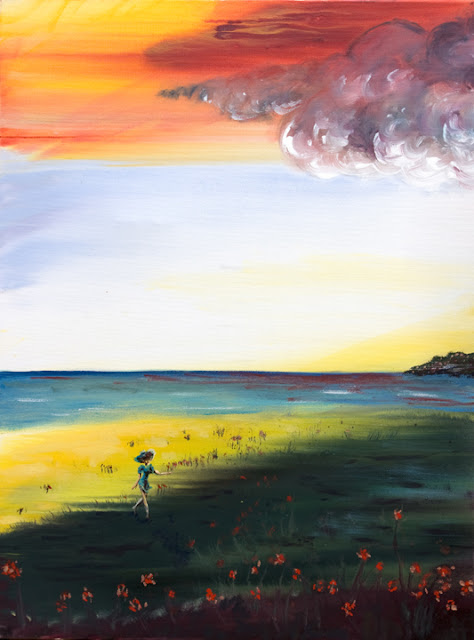 Hummm, il manque quelque chose dans ce paysage. Du sable doux et dorée pour s'y reposer et sur le bord de la mer des vagues qui égrainent leurs écumes blondes et rousses au rythme de mille et un battements de cœur. Est-ce le soir ? Non, un levé de soleil plein de promesses … Oh ! Qu'est-ce dans le coin de la toile ? Il vient vers moi il grandit, il tient quelque chose sous son coup... Encore un baratineur ?...
