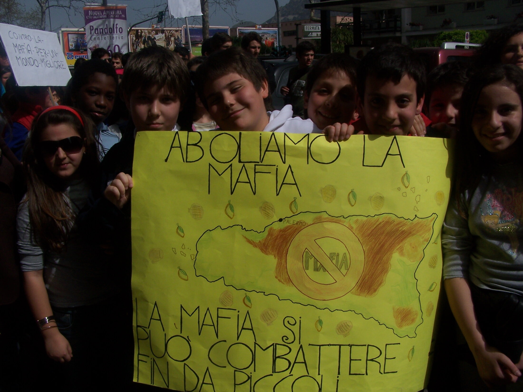 Il est 10H00 quand j'arrive sur la Via de Pragua et le stand, que j'avais vu vide la veille, accueille déjà une foule d'enfants et adolescents armés de banderoles et de panneaux. Ce joyeux monde est encadré par de multiples carabiniers dispersés en groupe afin d'éviter des incidents. Le cortège démarre. La parole libre et déterminée circule enfin. Parmi les cris, la voix énergique des enfants dominent. Ces citoyens futurs, qui sont l'avenir de l'Italie, accomplissent un acte historique par le seul fait de scander : Aboliamo la mafia ! (abolissons la mafia) dans les rue de Palerme. Probablement ne sont-il pas pleinement conscient de l'importance de ce fait. En protestant de façon collective, ils déverrouillent un réflèxe humain essentiel et l'auto-censure explose.