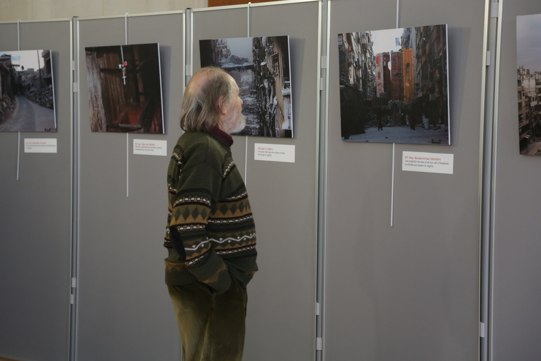 Une trentaine de photographies sont présentées au public parisien au sein de son exposition « Je suis de là bas… Je suis d’Alep… », à la Mairie du XXème arrondissement, du 6 au 29 mars 2017. L’occasion de s’entretenir avec lui sur le rôle du photographe de presse en tant de guerre, son parcours personnel et sa vision du conflit qui détruit la ville de son enfance.