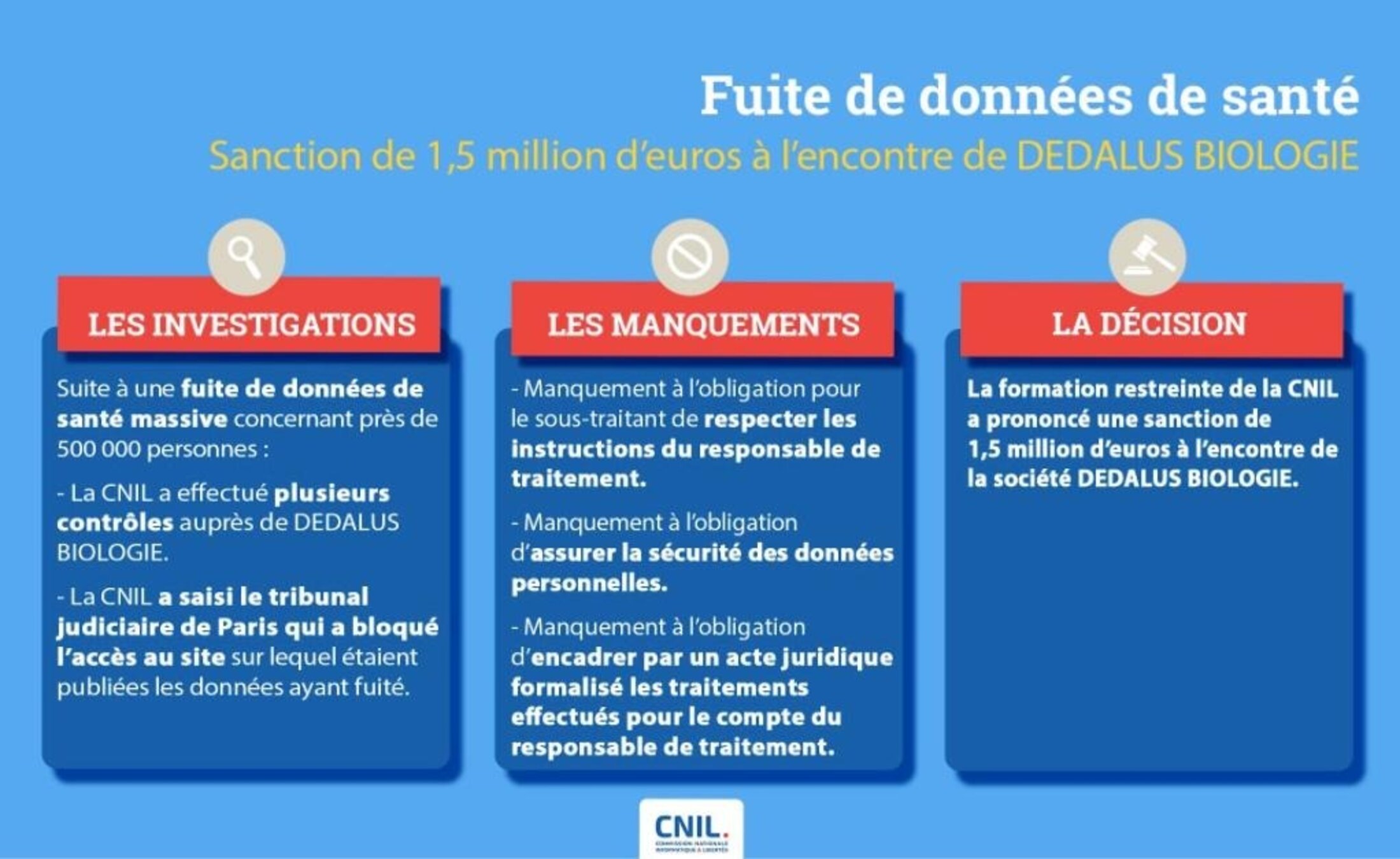 Le 15 avril 2022, la formation restreinte de la CNIL a sanctionné la société DEDALUS BIOLOGIE d’une amende de 1,5 million d’euros, notamment pour des défauts de sécurité ayant conduit à la fuite de données médicales de près de 500 000 personnes. Des failles signalées par un lanceur d'alerte licencié en 2020 après ses multiples alertes.