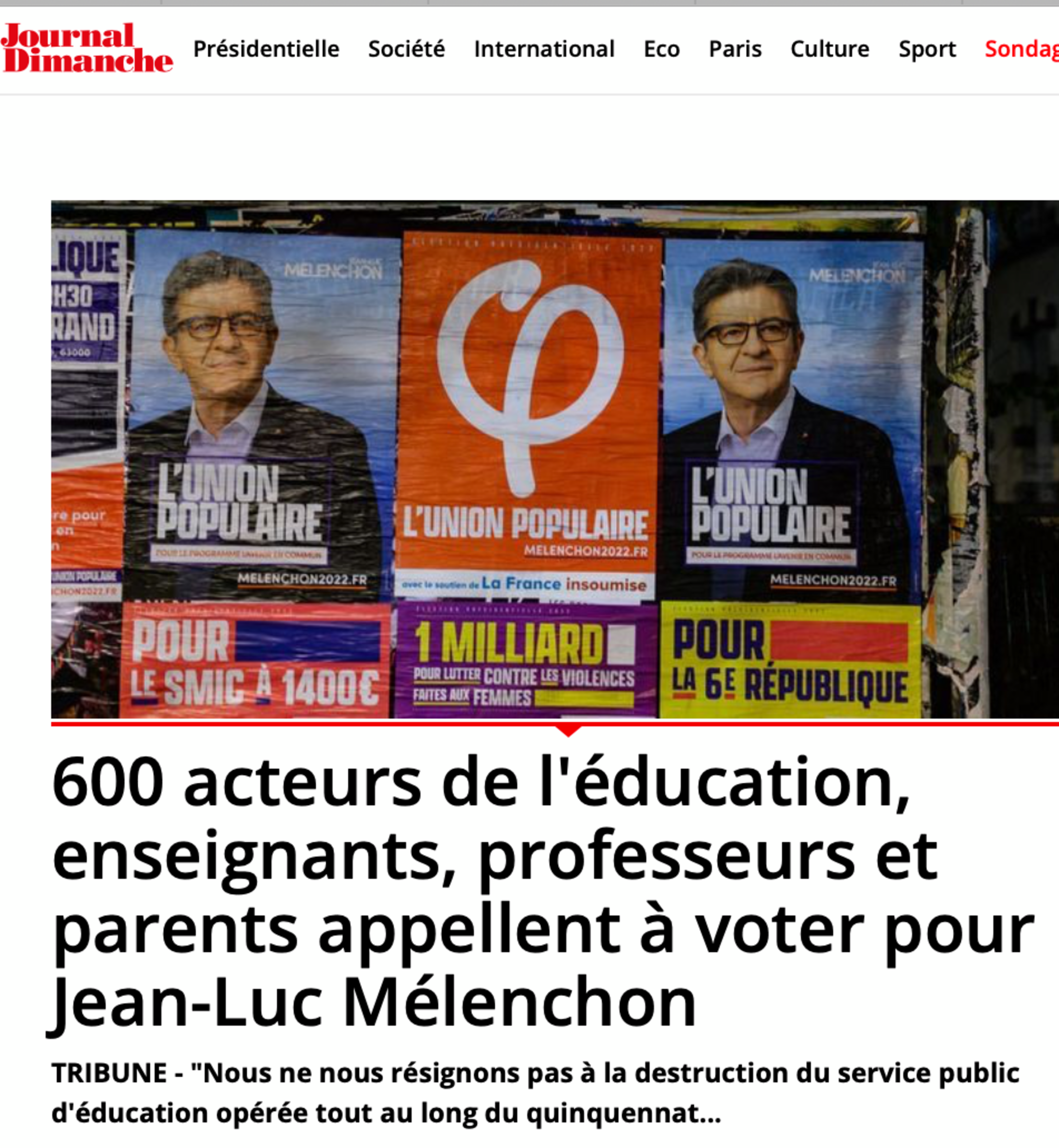 - Il y a, pendant ce temps, des appels d'enseignants qui se multiplient en faveur d'un vrai changement, d'une toute autre politique de l'éducation, portés par le candidat de l'Union Populaire.