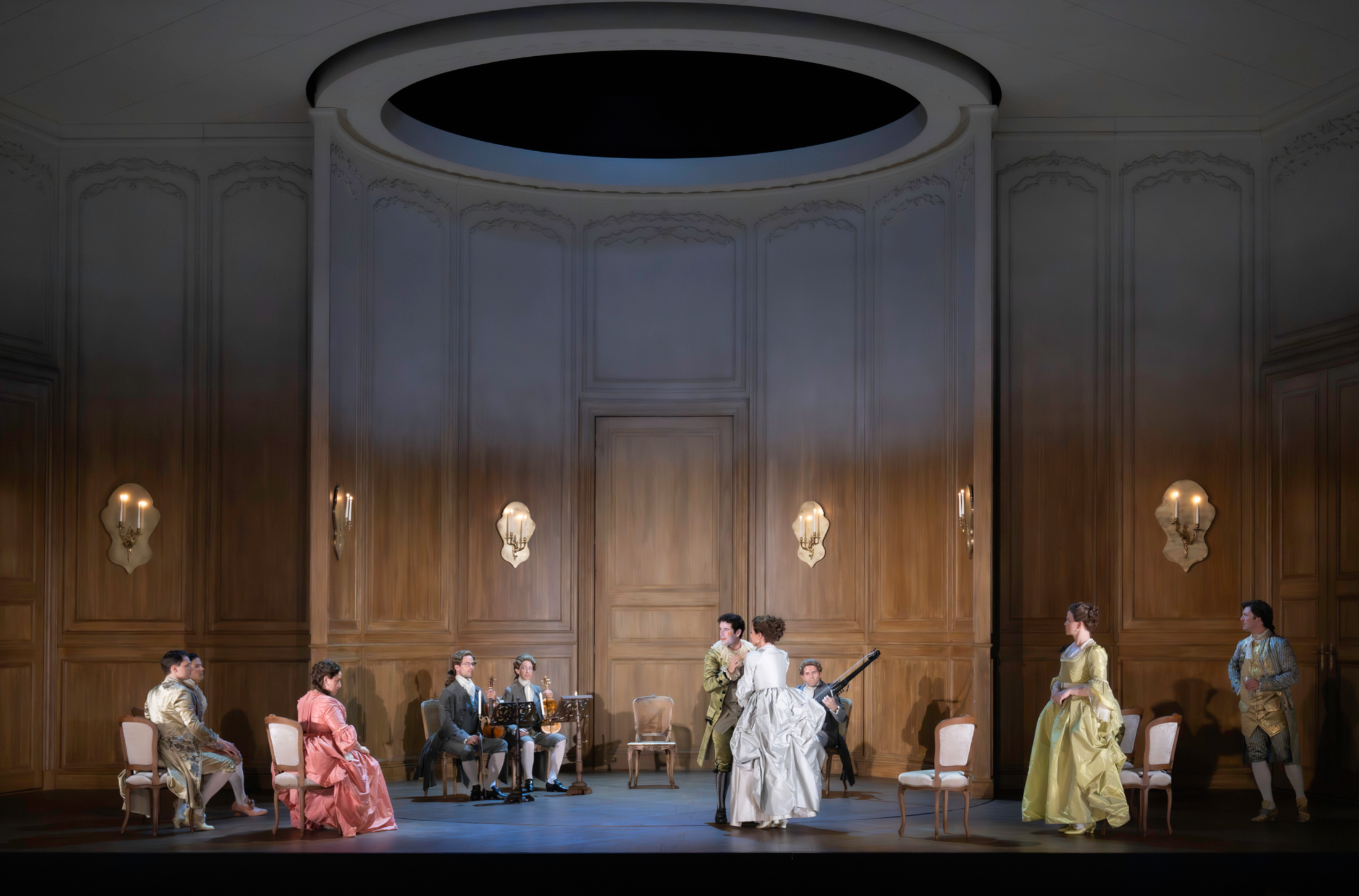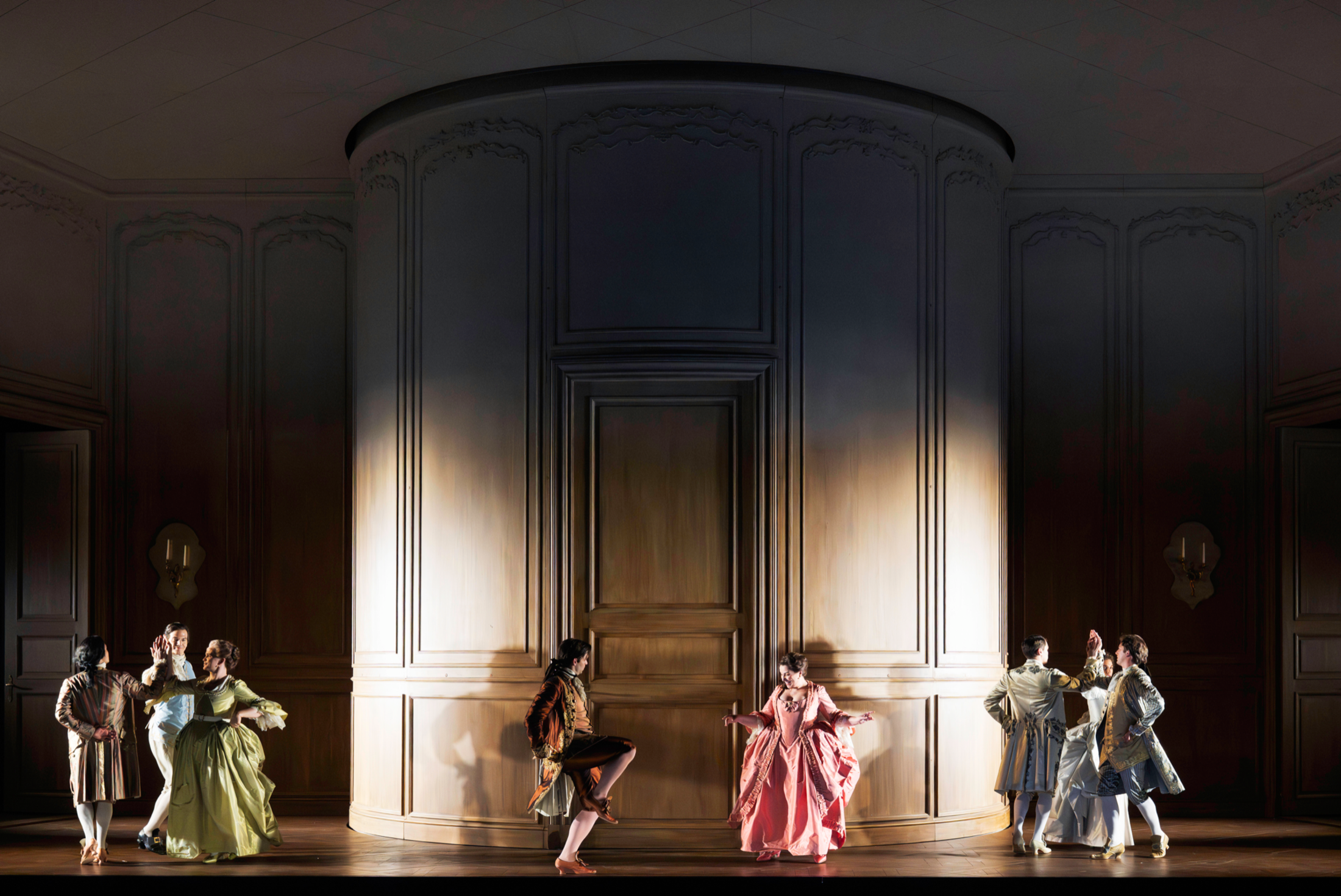 Les costumes pastels de Hannah Clark sont de toute beauté. Les danses de Dustin Klein chorégraphiées avec esprit et beaucoup d’humour. La scénographie de Julia Katharina Berndt et son décor brun lambrissé sont d’une rare élégance. Bien qu’il soit unique, un carrousel en son centre, particulièrement bien utilisé, permet de multiplier les scènettes et les atmosphères. Le Prologue donne le ton, y reconstituant une pompe funèbre versaillaise où un instant, Junon transforme la scène de déploration en imitation de Mater dolorosa. Le majestueux cercueil noir n’est autre que celui de Jupiter comme le spectateur le découvre après les trois grandes heures de l’opéra, lorsqu’il est tué par Calisto.