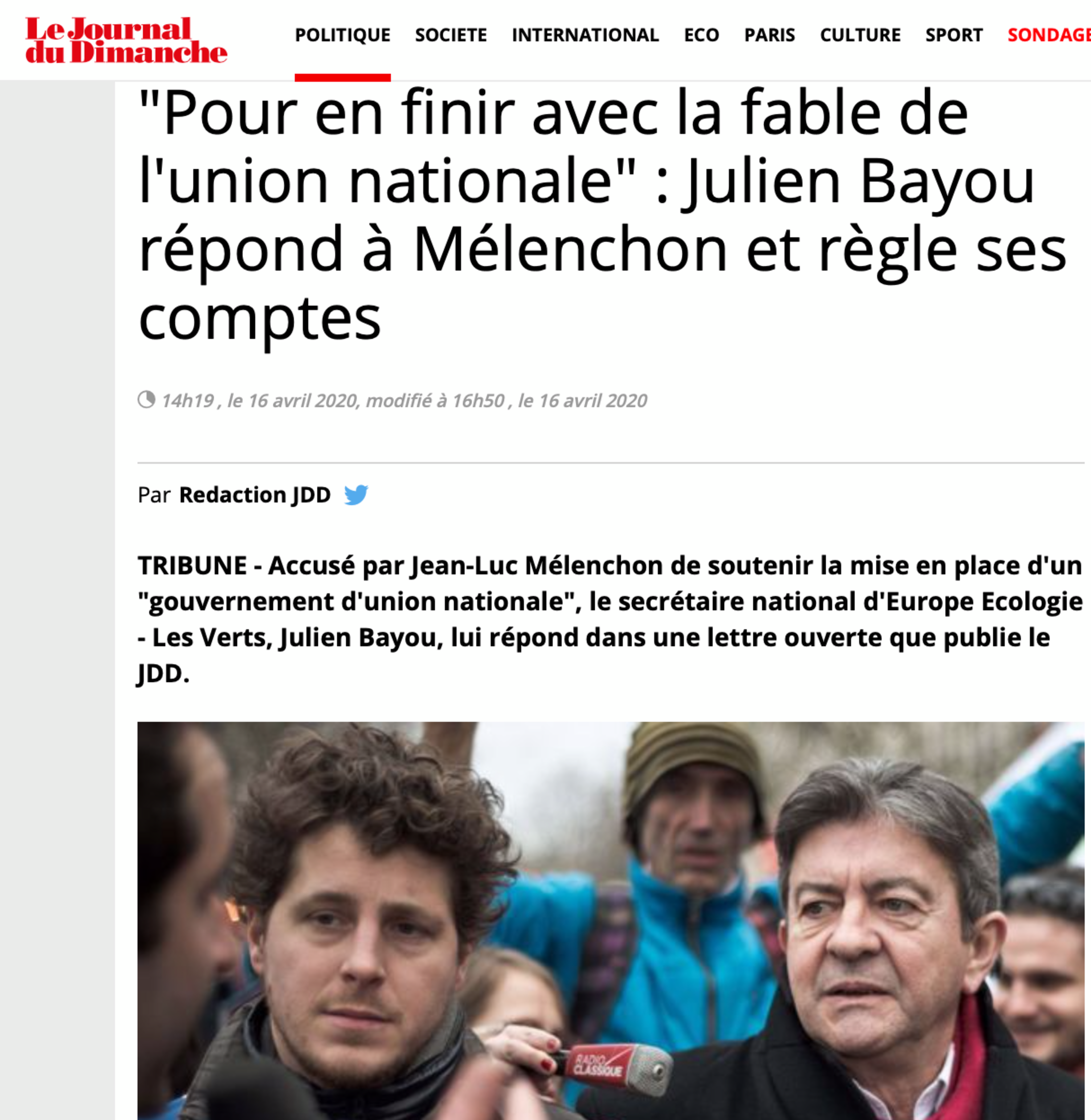 2/ Pourquoi tant de mots sans rappeler le point de départ, qui n'est pas l'insulte mais simplement la citation de Julien Bayou lui-même qui propose de réunir un Grenelle du monde d'après "à Matignon même." Je vous invite à lire les mots de Mélenchon avant la réponse de Bayou, pour un minimum de cohérence intellectuelle. C'est ici : https://melenchon.fr/2020/04/10/du-confinement-sanitaire-au-confinement-politique/