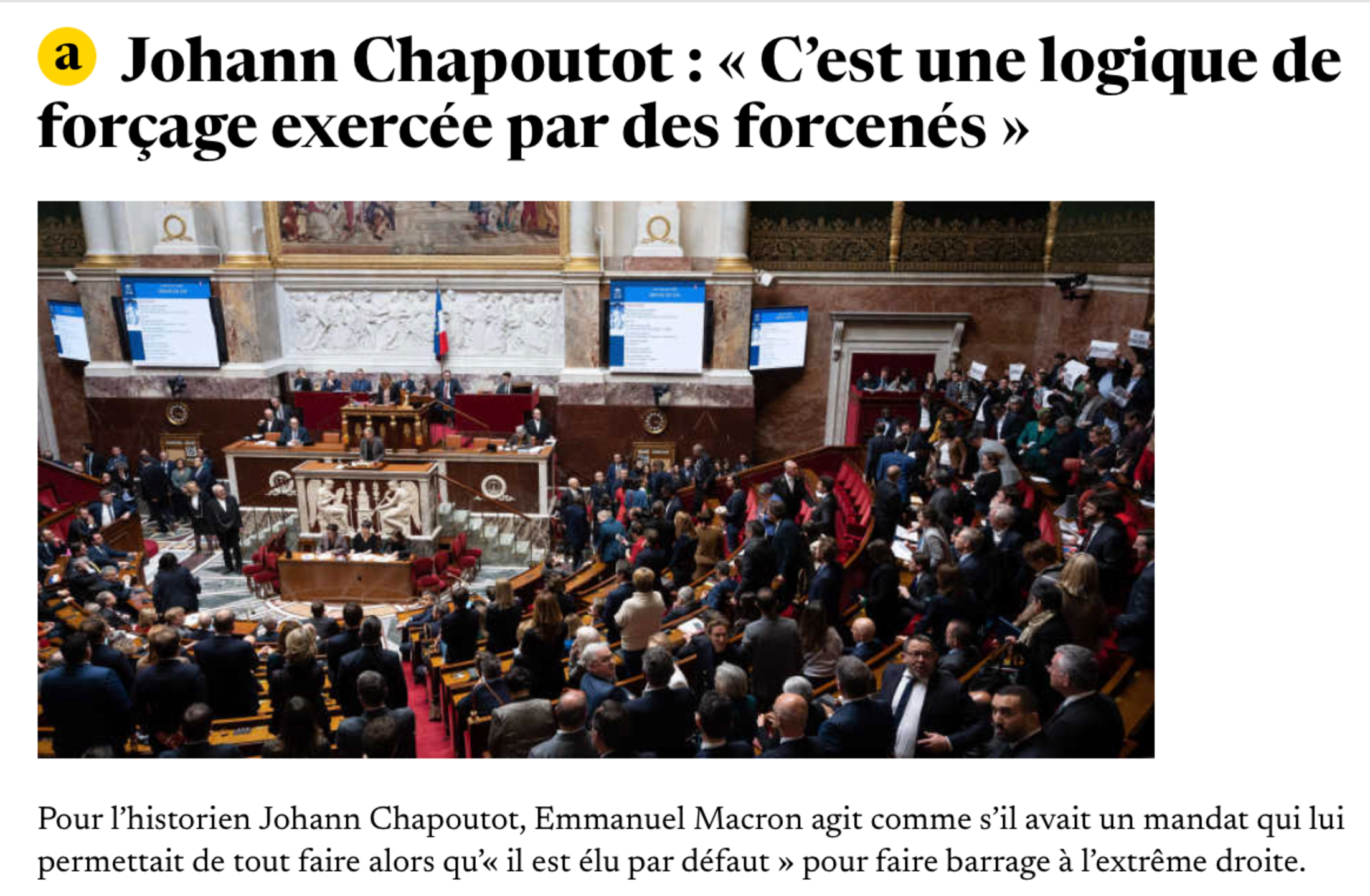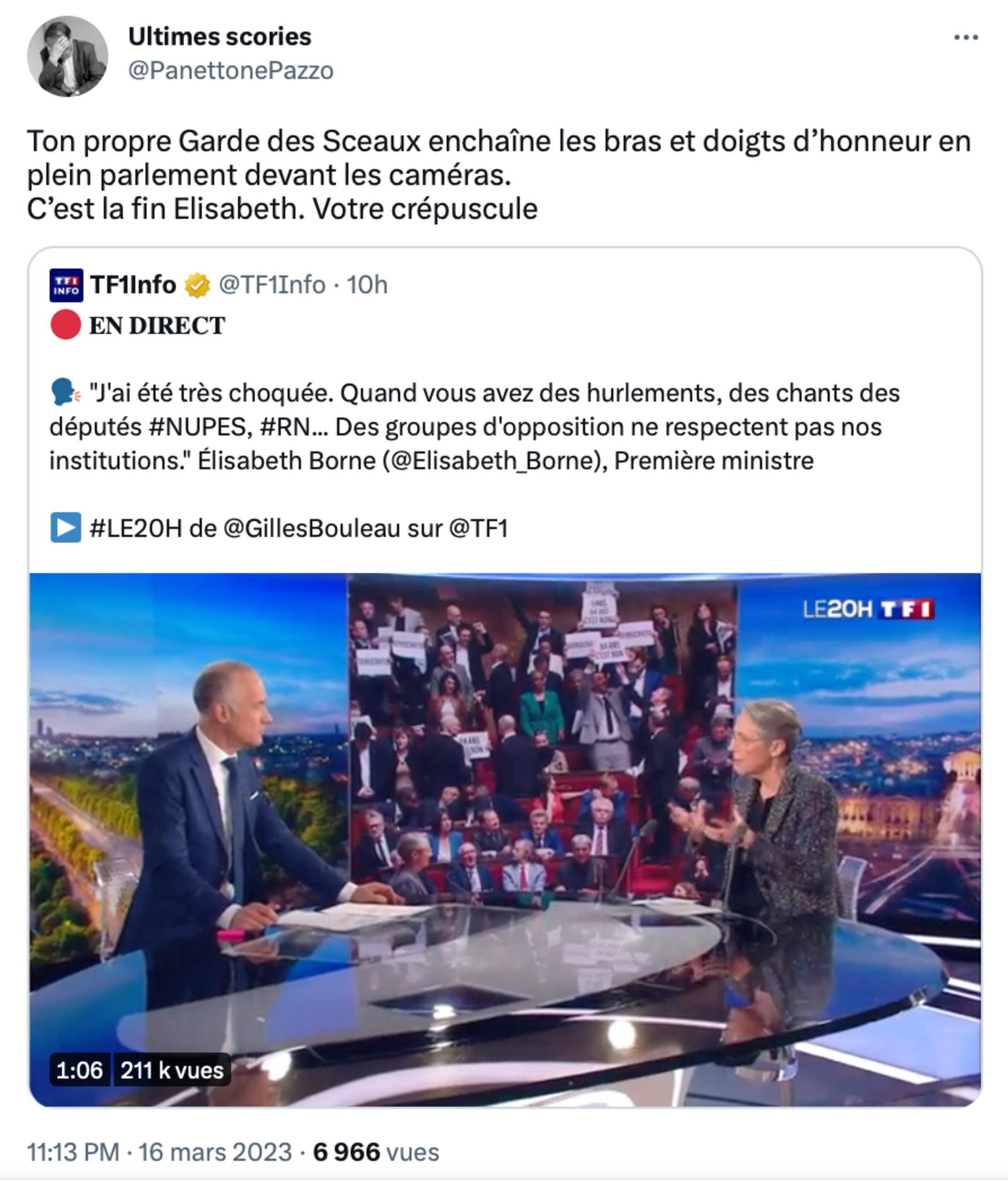 Sans parler des déclarations relevant d’un amalgame à côté de la plaque d’Elisabeth Borne jeudi soir sur le plateau de TF1, où elle venait défendre l’indéfendable, son 49.3 : non, les députés RN n’ont pas chanté La Marseillaise avec LFI et des membres de la NUPES - ce qui est tout sauf le non respect de nos institutions - ou alors, supprimons le chant national, hymne officiel de notre République qui a plus que sa place à l’Assemblée.