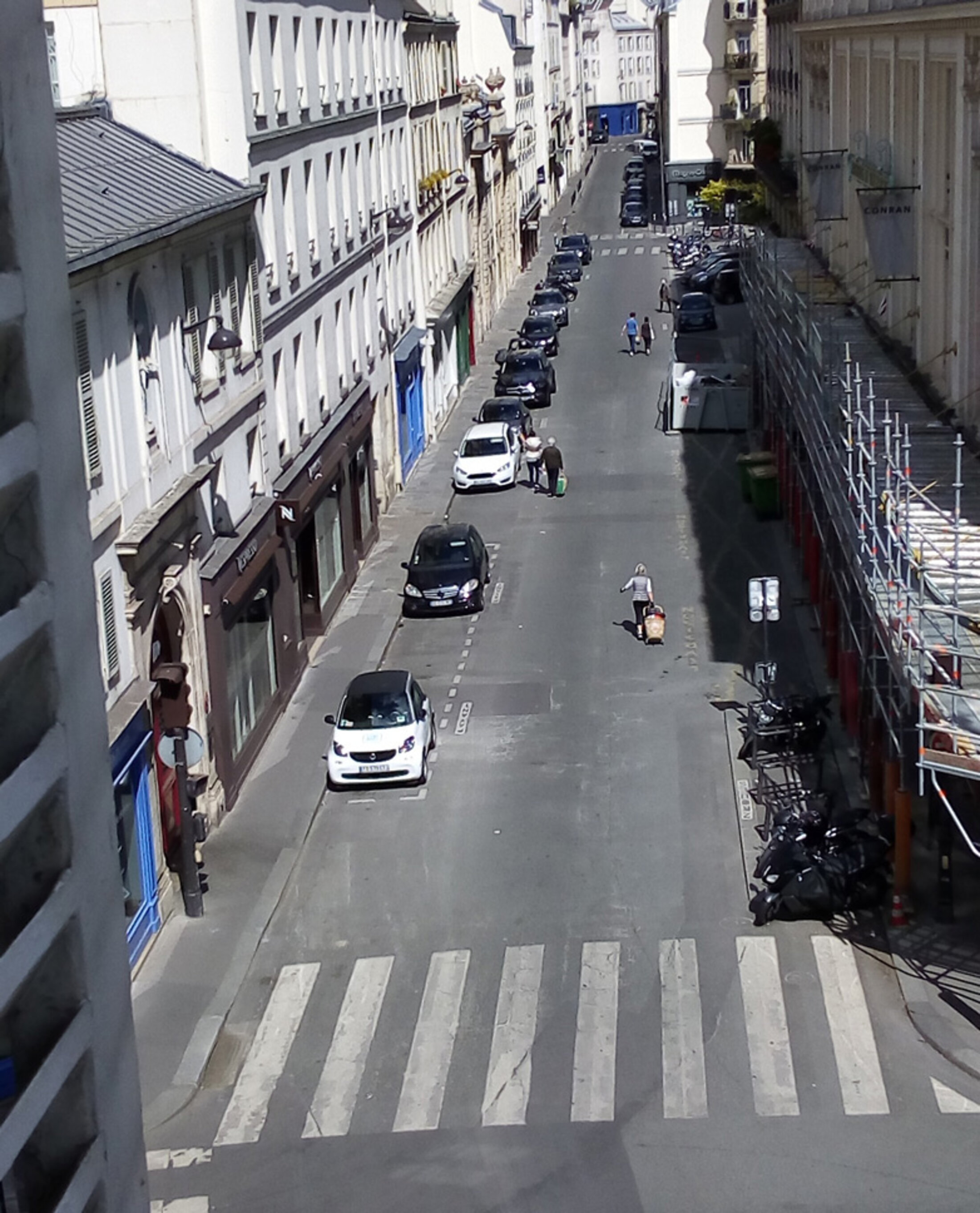 Ce week-end, la température est douce, autour de 20°C, le ciel est d'un bleu limpide, vide d'avions. Vers midi, de ma fenêtre, je vois quelques retours de course. Les acheteurs de premières nécessités prennent le temps de rentrer, flânent avec leurs sacs, discutent en famille. Mais, très vite, le flux se calme. Les gens de mon quartier restent respectueux de la consigne : "Restez chez vous".