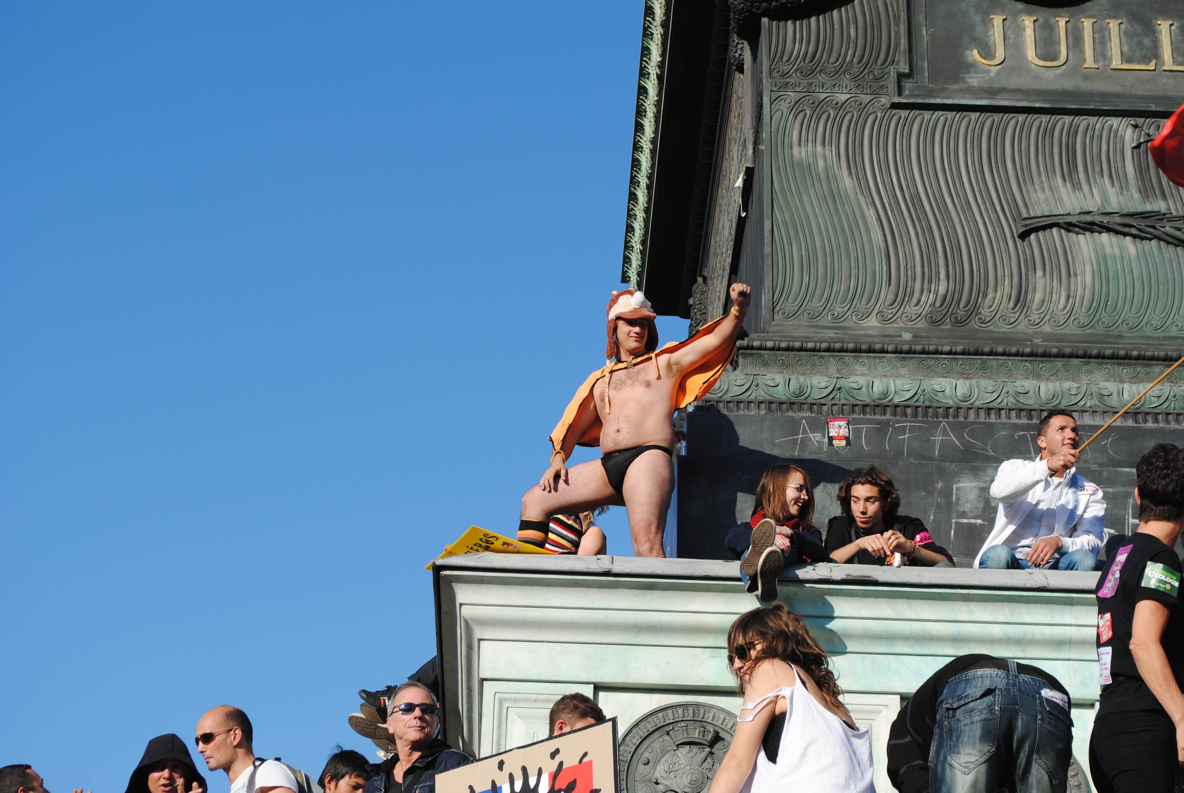 Voilà une autre façon de faire respirer la démocratie : merci à notre super-héros en grève, Slipman ! (manif du 12 octobre)