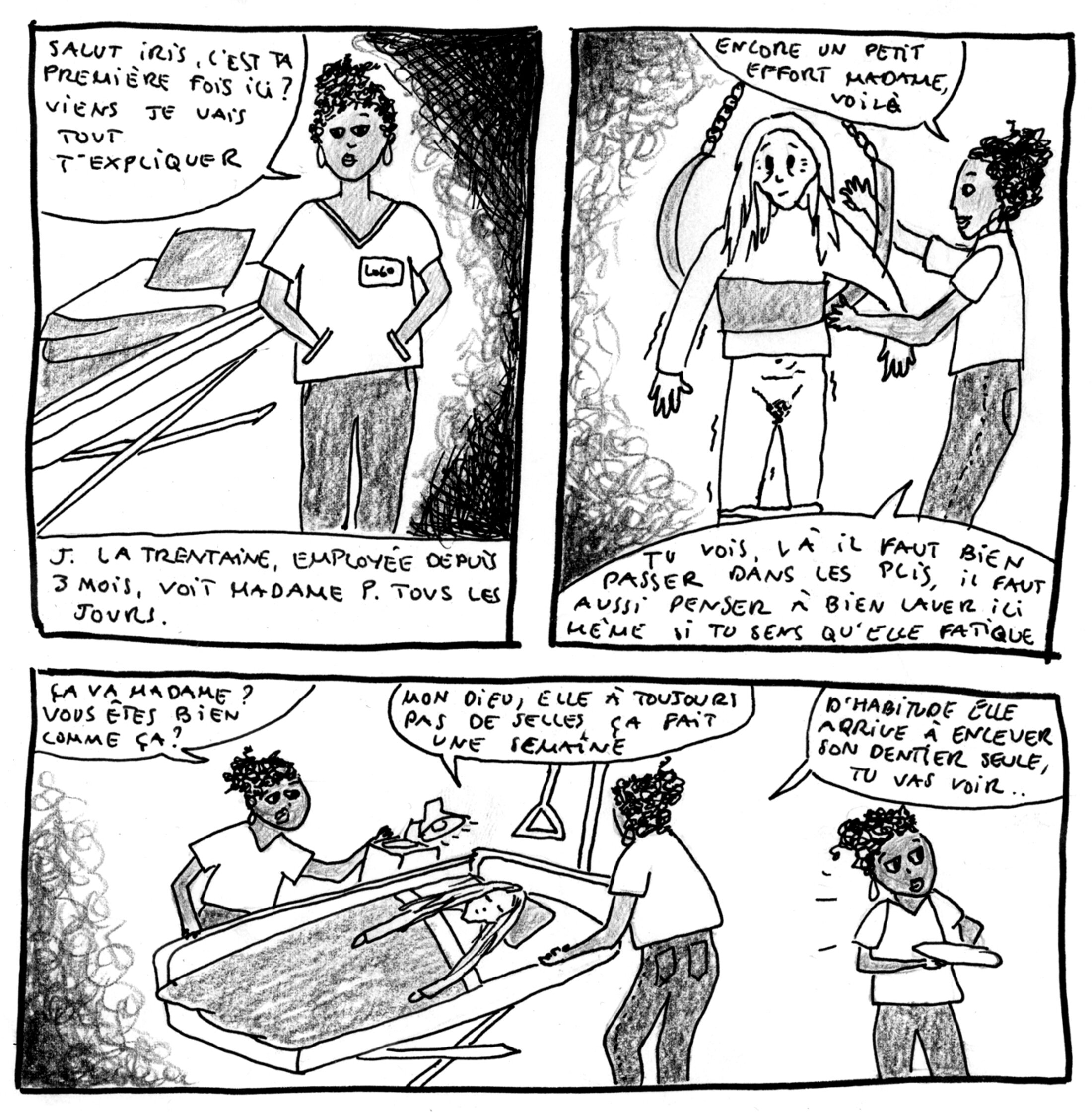 [Iris Estivals apprend de l’autogestion, de l’apprentissage par la création, d’une nécessaire émancipation. Sans doute en développe-t-elle une curiosité et un talent pour la question, à plusieurs endroits, et sait être tenace et libre. Elle collecte les outils, par exemple la radio, et le son qui la traverse. Elle s’empare du legs collectif, tente d’apprivoiser le monde, le regarde attentivement. Iris étudie le réel, dont ce réel qui dégringole. La contribution qu’elle propose ici (bande dessinée et texte) croise les préoccupations liées au travail intérimaire, au travail des femmes venant d’un pays du Sud du globe, au soin donné aux personnes âgées, à la relation à la vieillesse telle que vécue par une jeune femme. Dans ce réel qui dégringole.]