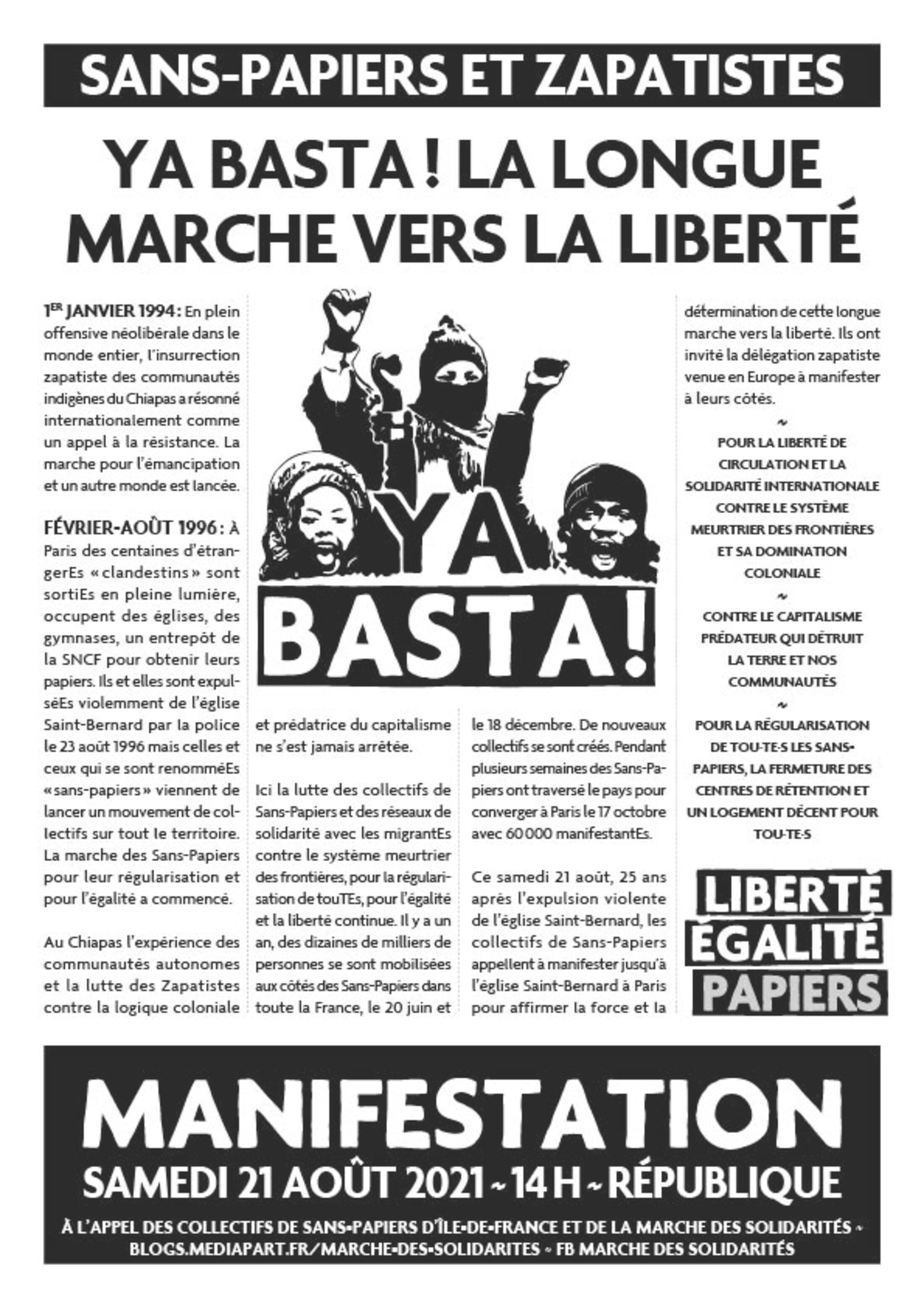 Ce samedi 21 août, 2021 25 ans après l’expulsion violente de l’église St Bernard, les collectifs de Sans-Papiers appellent à manifester jusqu’à l’église St Bernard à Paris pour affirmer la force et la détermination de cette longue marche vers la liberté. Ils ont invité la délégation zapatiste venue en Europe à manifester à leurs côtés.