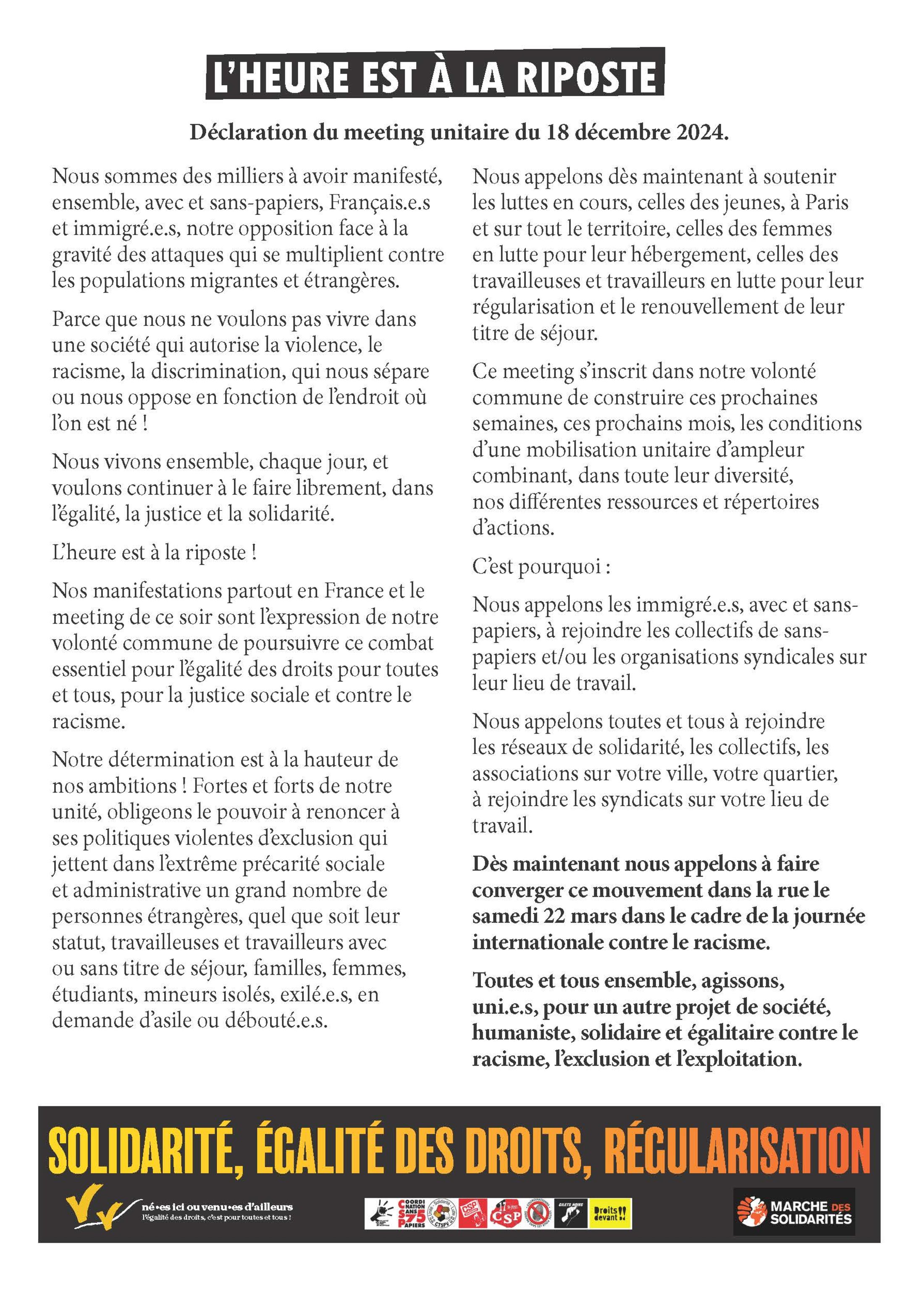 Ce meeting s’est conclu par un appel commun des deux cadres qui ont appelé à ces manifestations, réunissant ainsi l’appel lancé par la Marche des Solidarités et les 300 organisations signataires avec les Collectifs de sans-papiers et de jeunes et les syndicats et associations réunis sous l’appel « Né.es ici ou venues d’ailleurs ».