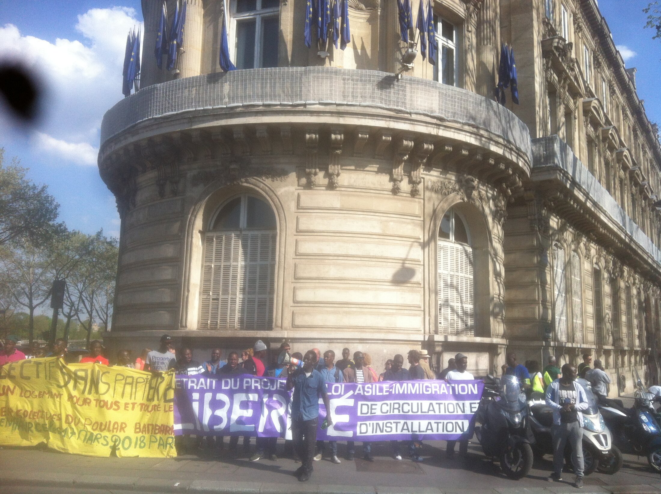 Ce vendredi à 17H, des dizaines de sans-papiers de la CSP7 et du CSP Paris 20 et des soutiens ont tenté d'accéder au balcon du bureau d'information du parlement européen face à l'Assemblée nationale boulevard St Germain avec une banderole pour exiger le retrait du projet de loi asile-immigration, pour la liberté d'installation et de circulation, l'arrêt de Dublin et des expulsions et la régularisation de tous les sans-papiers.