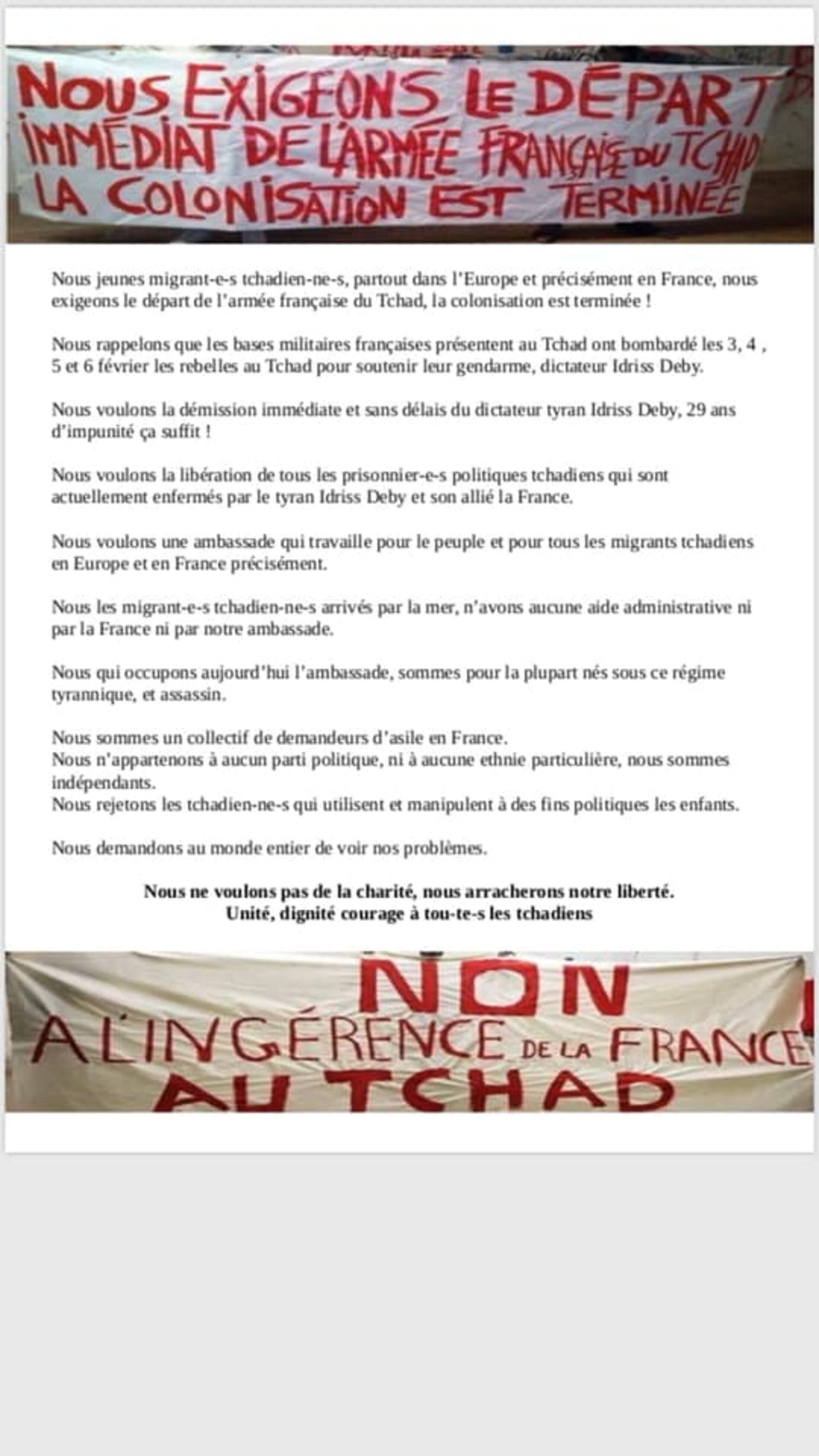 Mardi de jeunes Tchadiens en lutte contre le régime dictatorial d'Idriss Déby et l'ingérence française ont occupé l'ambassade du Tchad obligeant l'ambassadeur à fuir leur colère. Pour contrer l'immonde couverture des médias français nous publions ci-dessous leur communiqué.