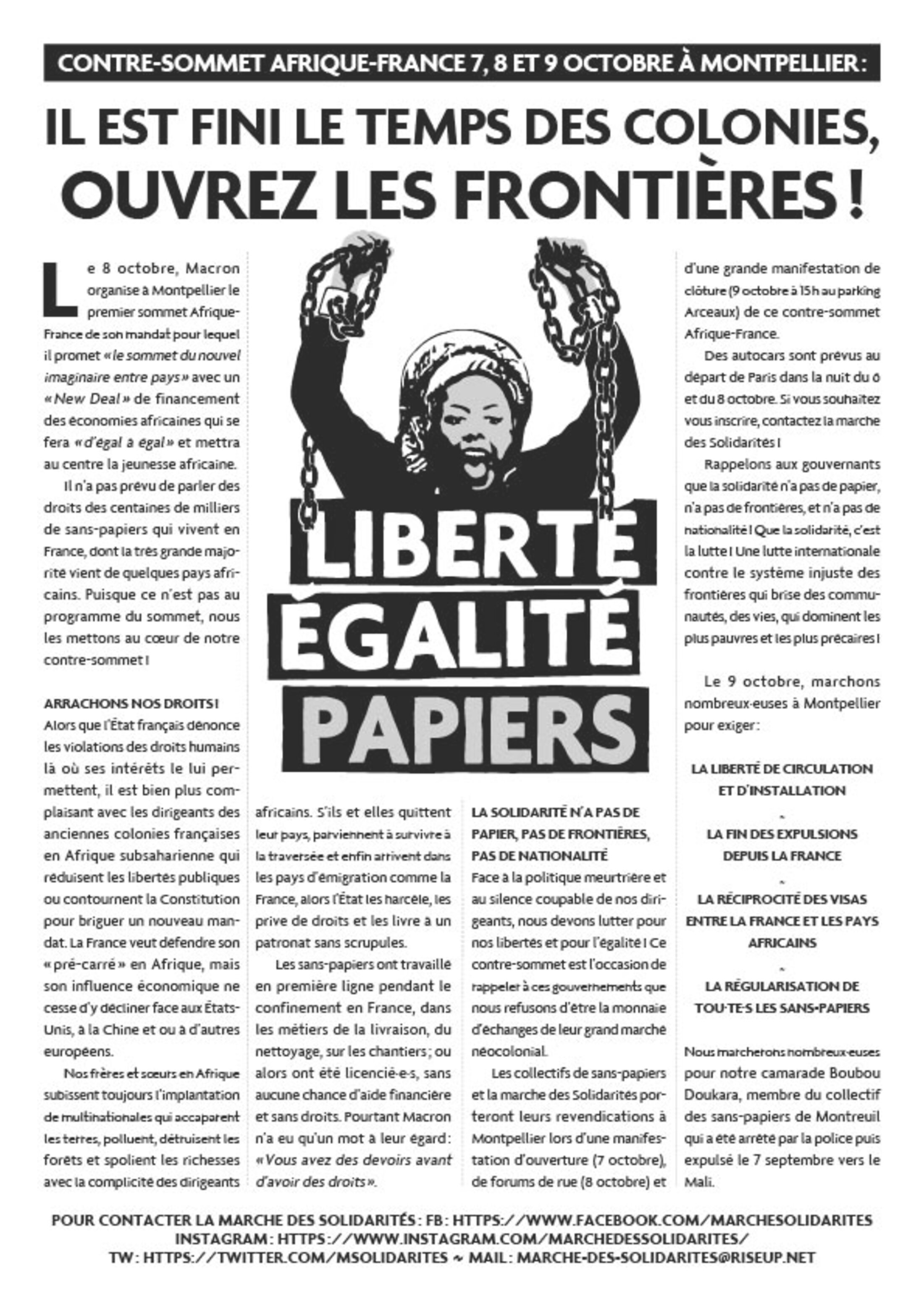 A l'appel de plusieurs collectifs de sans-papiers et de la marche des solidarités, nous manifesterons à Paris ce vendredi 1er octobre entre République et Père Lachaise et prendrons la parole devant 4 foyers de travailleurs migrants (Rue de la Fontaine au Roi, Rue Bisson, Rue des Amandiers et Rue Fernand Léger) pour préparer le contre-sommet Afrique-France qui aura lieu à Montpellier les 7, 8 et 9 octobre.