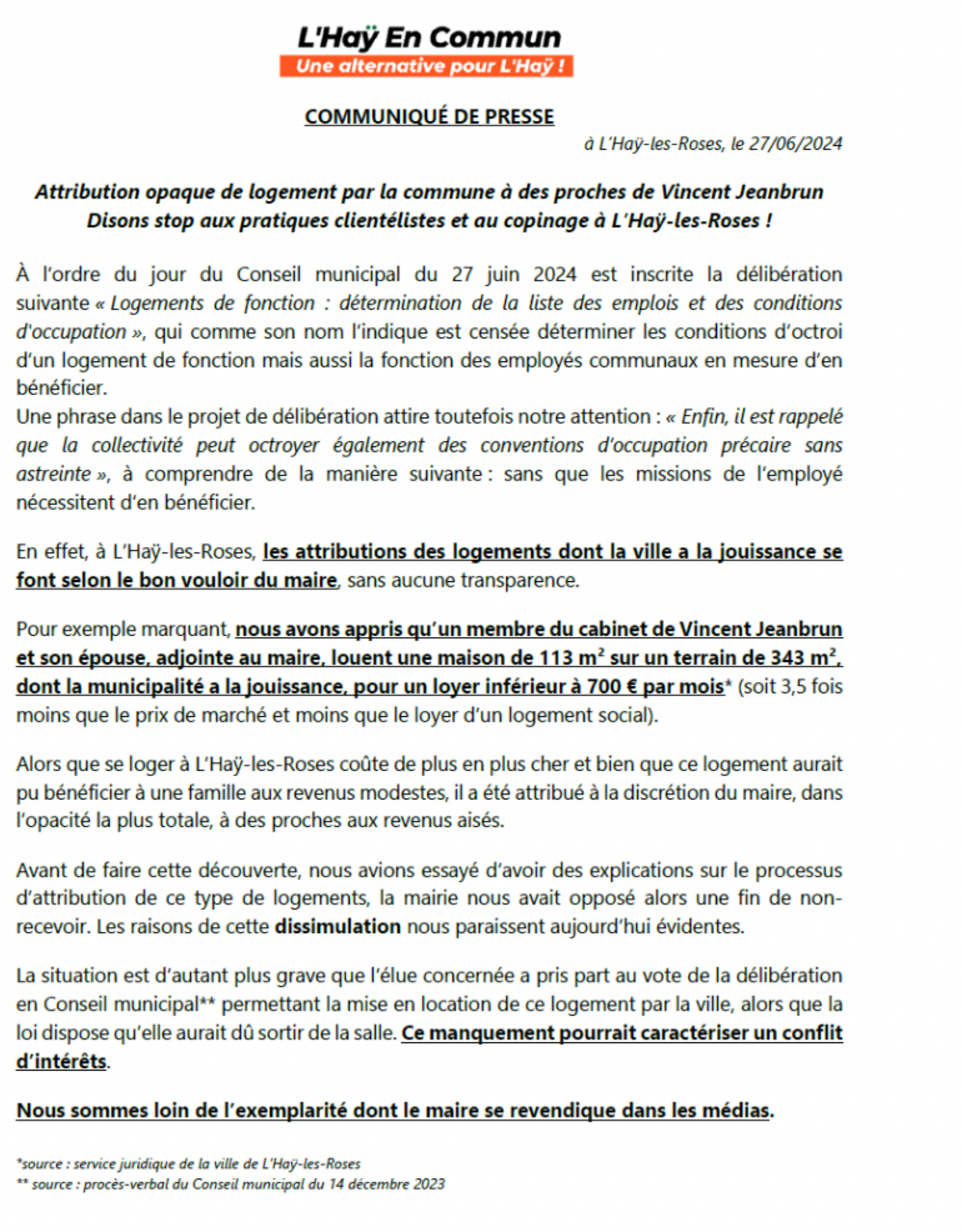 Je relaie ici le communiqué de presse du 27 juin 2024 du groupe d'opposition "L'Haÿ En Commun" qui révèle les pratiques intolérables et condamnables du maire la Morale Vincent Jeanbrun, le candidat aux législatives qui clame partout La République, c'est moi! Le pov'chef de cabinet, pilier LR depuis des décennies et son épouse maire adjointe, Jeanbrun est allé jusqu'à Puteaux chez son ami Vincent Franchi pour les recruter. C'est bien normal de loger pas cher les amis qui rendent des services. Et puis, ce sont des amis discrets, si discrets...
