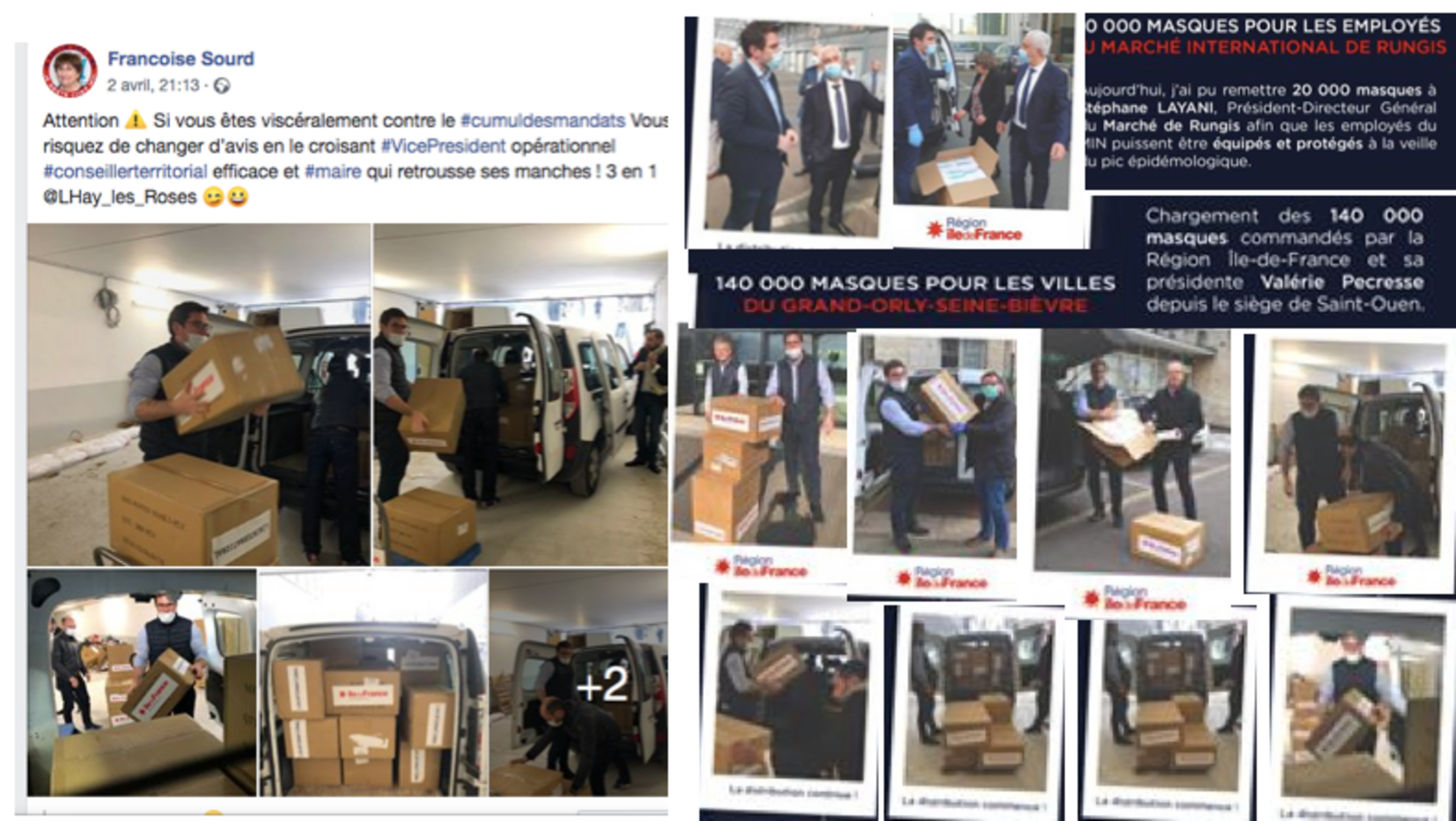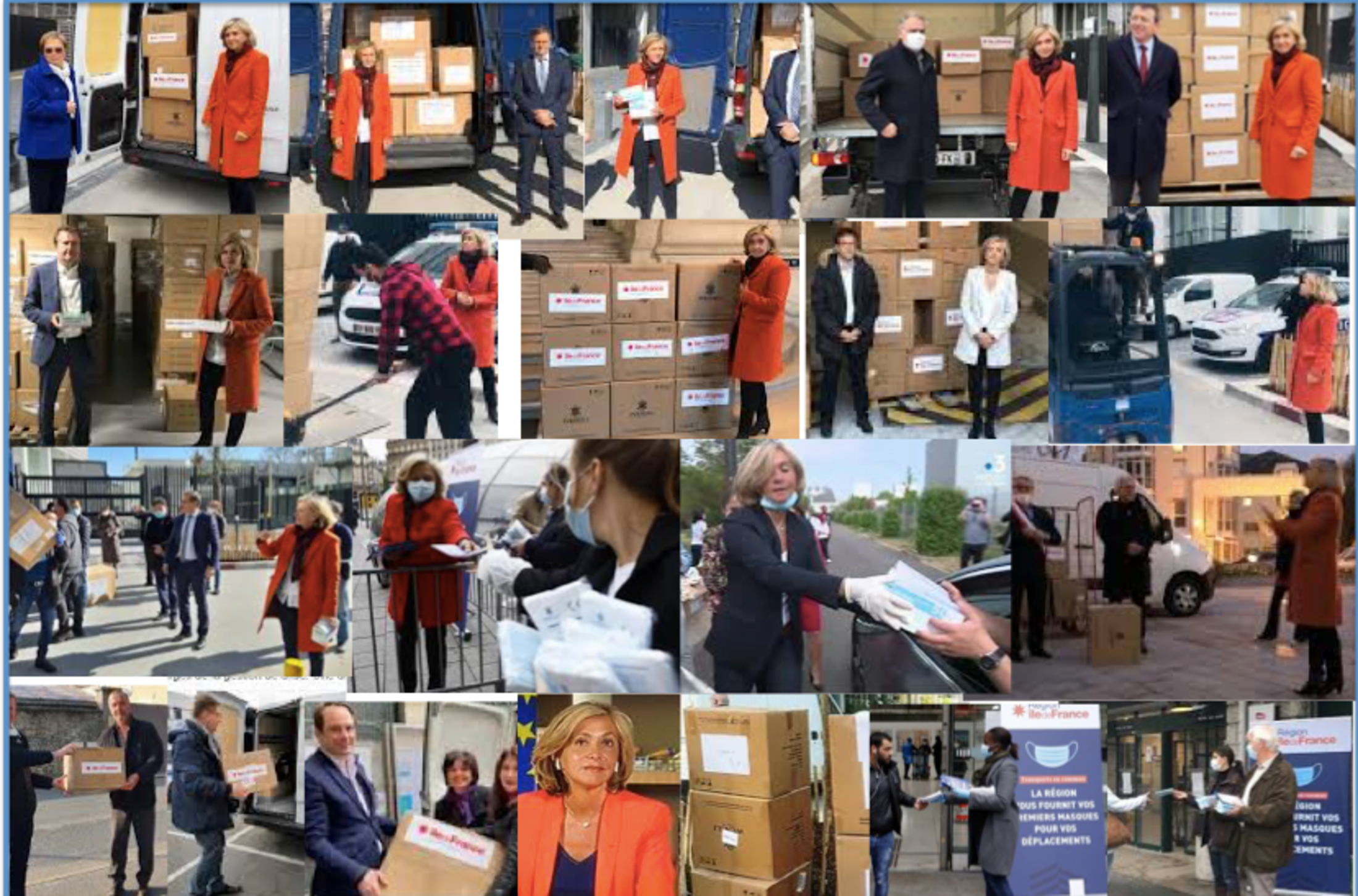 Quelle aubaine pour ces politiciens narcissiques et carriéristes ! La distribution des masques ? Un bon plan pour parader avec photos à gogo. Ici, un aperçu de la mise en scène de Valérie Pécresse avec « ses » dons de masques.) (photo). Les cartons sont tournés du bon côté et Mme Pécresse fait la pose, à visage découvert de préférence.