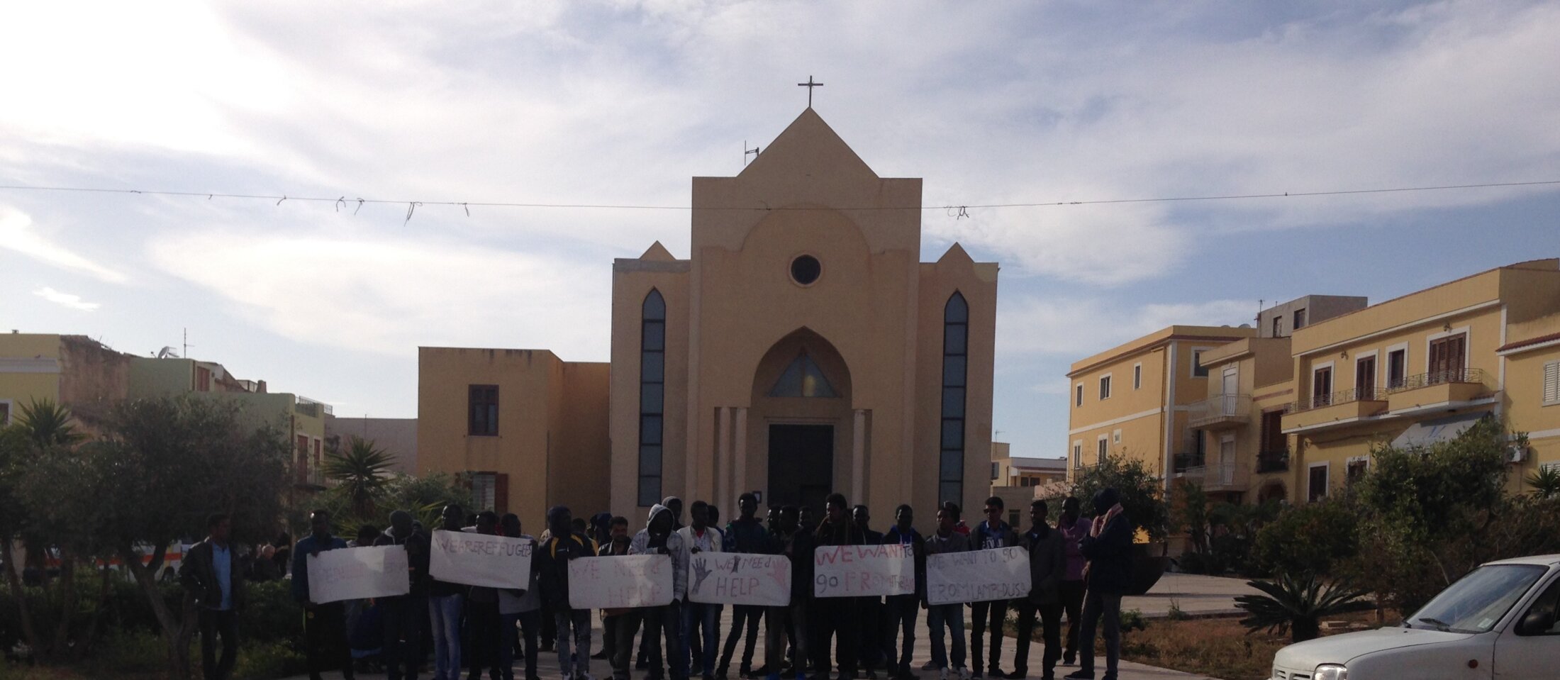 Normalement, au bout de 72h, les migrants, « triés » arbitrairement entre demandeurs d’asile et « migrants économiques », sont transférés en Sicile. En réalité, il arrive que les centres en Sicile soient surpeuplés et que les migrants ne soient pas transférés. Ou bien qu’ils refusent de donner leurs empreintes car ils souhaitent continuer leur chemin et non rester en Italie. Pourtant, en vertu du Règlement européen de Dublin, il est obligatoire de demander l’asile dans le premier pays européen où l’on a posé le pied, ce qui revient à faire peser la charge de l’accueil à l’Italie ou à la Grèce. En mai 2016, une cinquantaine de Somaliens, Erythréens, Soudanais et Yéménites ont décidé de protester : ils voulaient être transférés sans donner leurs empreintes. Une majorité d’hommes et quelques femmes, dont une enceinte sont restés, nuit et jour, sur la place de l’église, assis par terre en portant des pancartes « We want freedom ».
