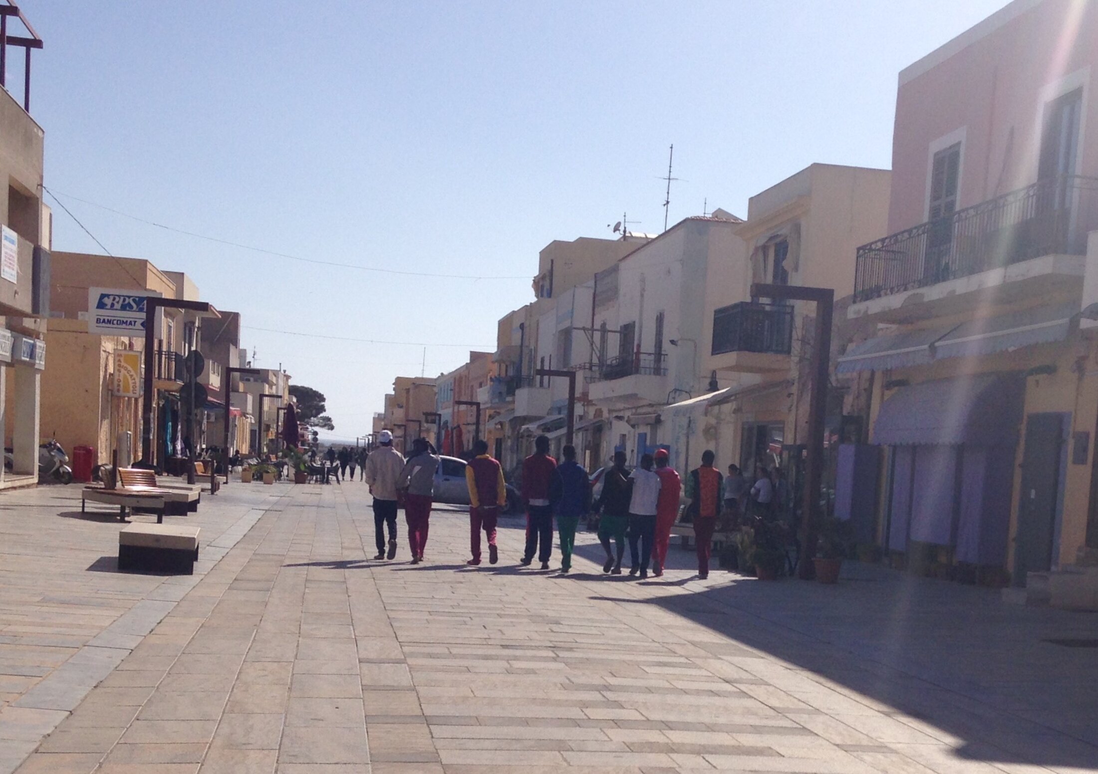 Ainsi, dans la petite île de Lampedusa, des groupes, majoritairement composés de jeunes hommes aux traits tirés, se promènent dans les rues, boivent des cafés, ou encore vont à la plage. Mais ils restent toujours en marge de la population locale, ils s’installent à l’extrémité de la plage Cala Guitgia, là où il n’y a personne, « pour ne pas déranger » et parce qu’ils « n’arrivent pas à communiquer… ici personne ne parle anglais ».