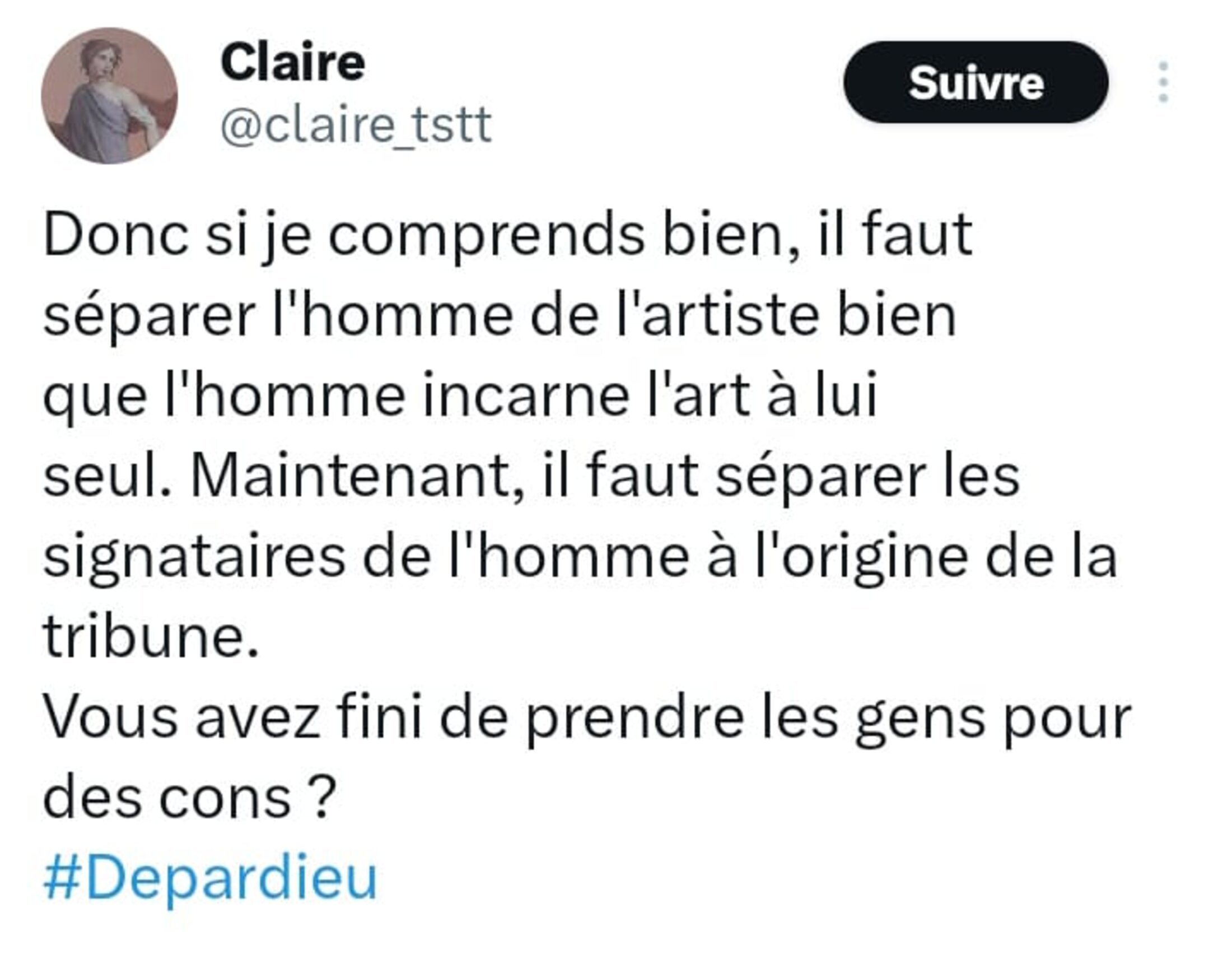 « Je n’en peux plus de ces gens qui défendent G. Depardieu en soulignant ses talents d’acteur. Personne ne l’accuse d’être un mauvais comédien, 14 femmes l’accusent de VIOLS, AGRESSIONS SEXUELLES, HARCÈLEMENT SEXUEL. C’est sur ça et uniquement sur ça que le débat doit porter. »4