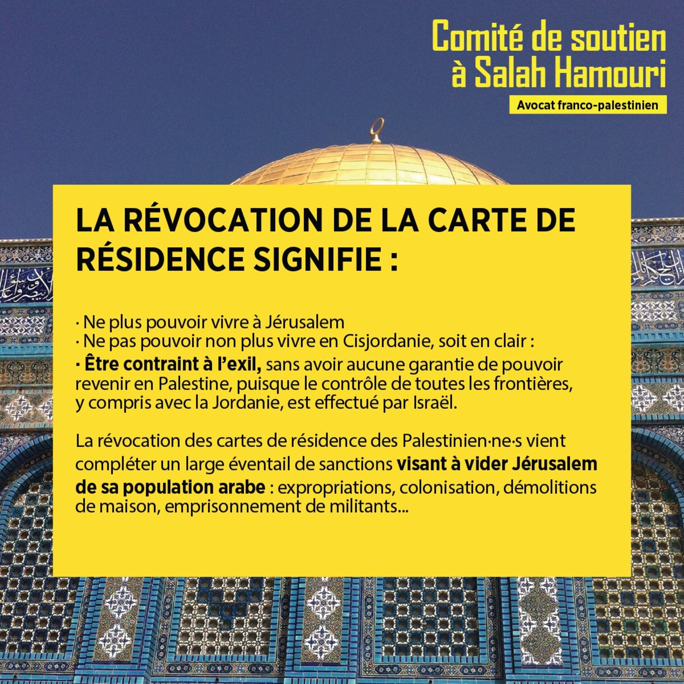 Tôt ce matin, Salah Hamouri, Franco-palestinien de 36 ans, défenseur des droits humains et avocat à l'association Addameer pour le soutien aux prisonniers et la défense des droits humains, lui-même ancien prisonnier, a été notifié officiellement de la décision de la ministre israélienne de l'Intérieur de révoquer son permis de résidence permanente, décision fondée sur la “violation d'allégeance”.