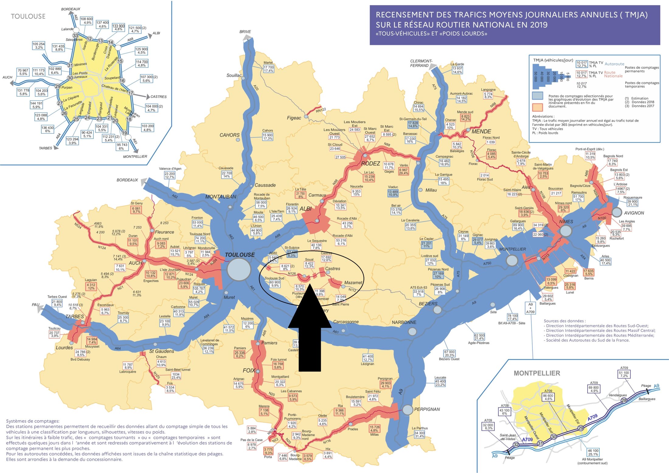 Dans ce dossier d'autoroute, les services de l’État ne se préoccupent pas de répondre aux arguments des opposants tant les données objectives plaident pour un abandon du projet. Si l'on en croit les simulateurs d'itinéraires, le gain de temps de cette autoroute par rapport à la route actuelle serait de l'ordre de 12 minutes avant d'atteindre les bouchons toulousains. Comment alors expliquer la démesure d'un péage Castres-Toulouse qui oscillerait entre 8 et 10 Euros (prévisions issues du dossier DREAL) ? Pour une raison simple : les derniers comptages effectués par la DREAL en 2019 dévoilent un trafic cruellement insuffisant pour justifier le recours à une autoroute payante parallèle à une route existante (carte DREAL : une fraction de 5600 véhicules sur le trajet complet).