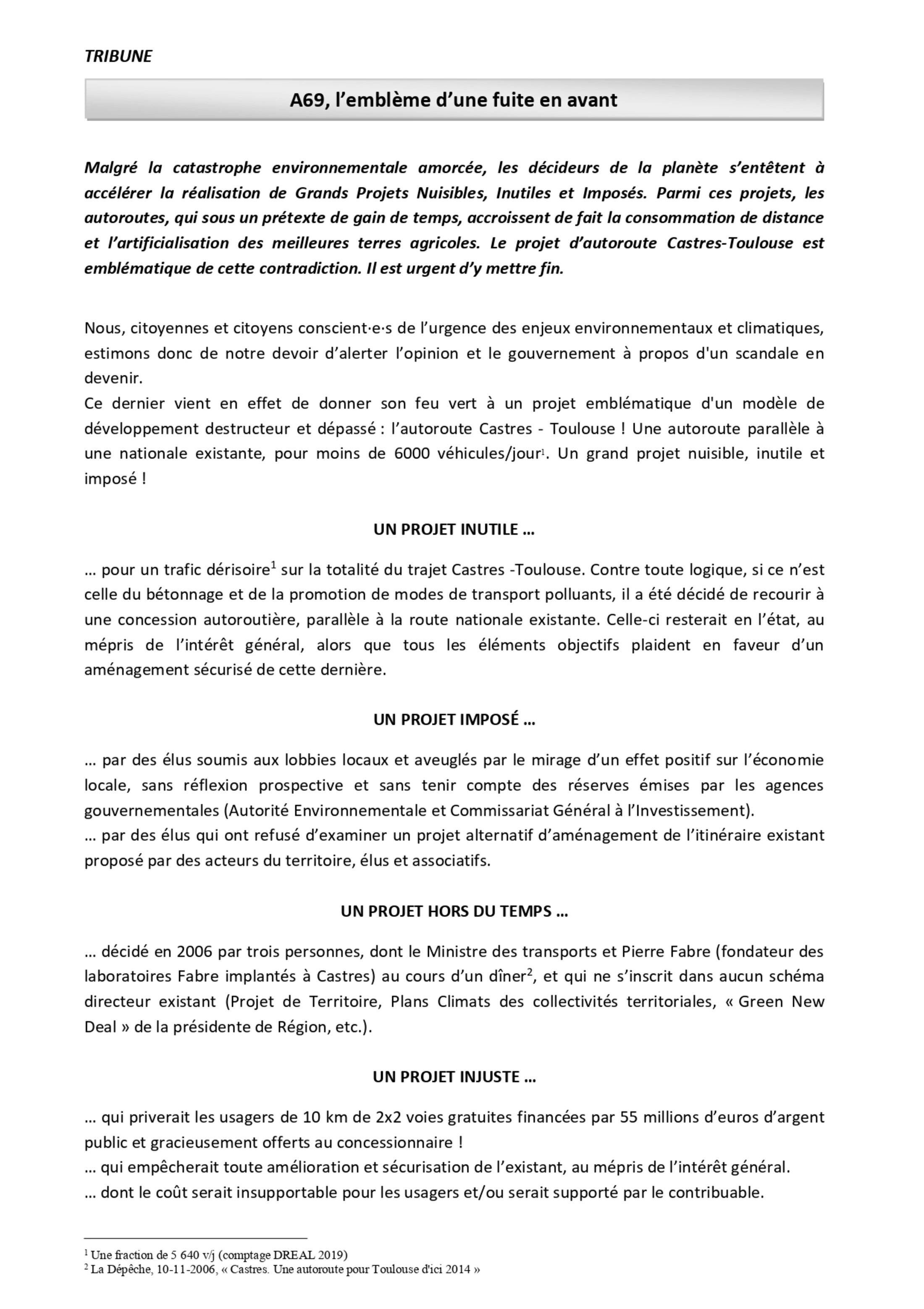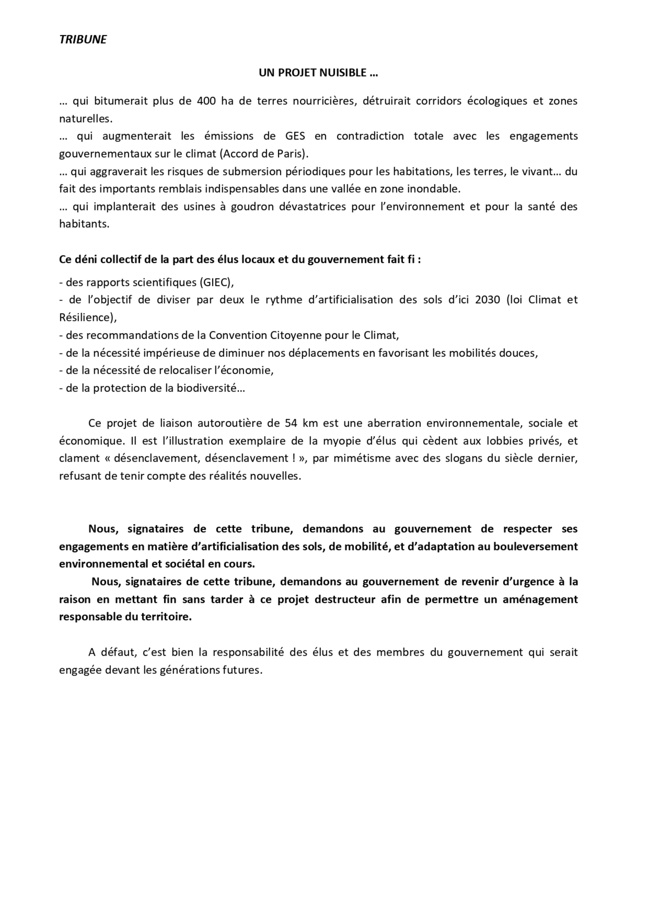 Retrouvez la tribune, les signataires, et l'actualité du projet d'A69 sur le site du collectif la Voie est Libre : www.lvel.fr