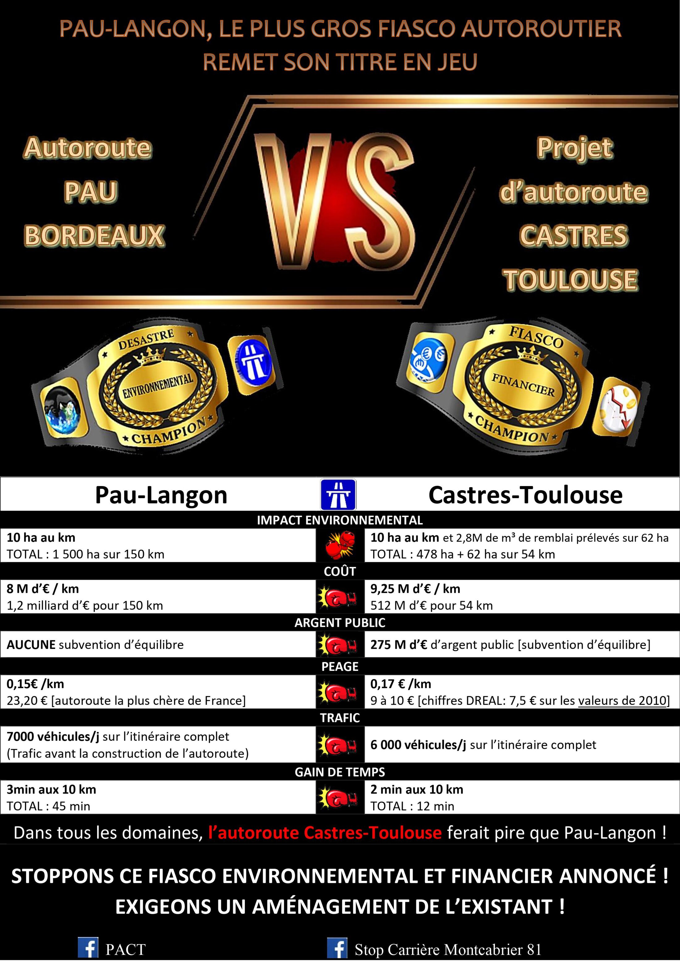 Ce projet dépasserait en tous points les plus gros échecs autoroutiers ayant vu le jour, mais une fois n'est pas coutume les finances publiques se substitueront à la rentabilité ! Le désert autoroutier entre Pau et Langon, où l’expertise citoyenne n’a pas été entendue, ne semble pas avoir refroidi les pouvoirs publics. Les collectifs PACT et SCM81, qui défendent une alternative à l'autoroute Castres-Toulouse, ont publié un comparatif avec la liaison Pau-Langon pour visualiser le désastre que représenterait le projet.